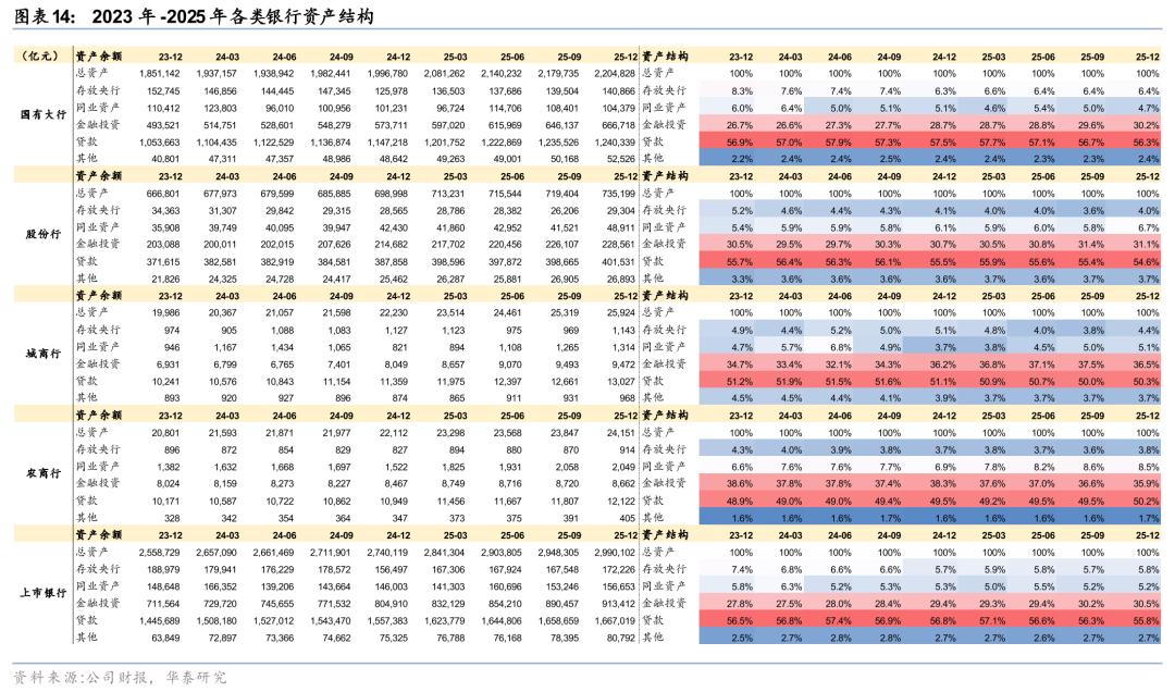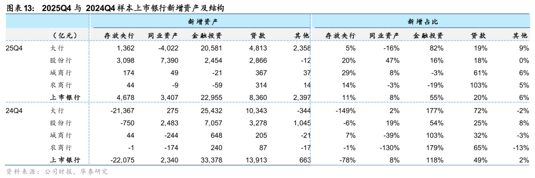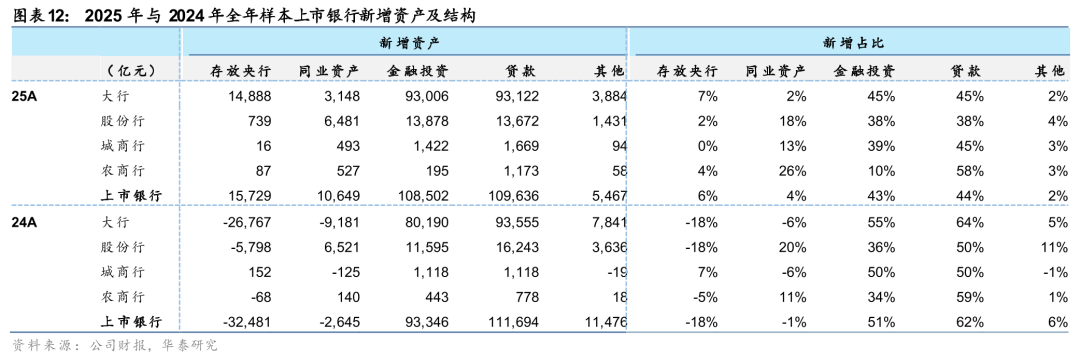 分银行类型看,城农商行规模增速提升幅度较大,国股大行扩表速度回暖。25年末大行、股份行总资产增速分别为10.4%、5.2%,较24年末分别 2.6pct、 0.4pct,在各类银行中资产增速提高幅度偏弱,但较24年增速有明显提升。在有效需求较弱,叠加监管均衡信贷投放、打击资金空转的导向下,大行信贷增长延续放缓趋势。25年大行新增资产20.8万亿元,同比多增6.2万亿元,其中存放央行、同业资产、金融投资分别同比多增4.1万亿元、1.2万亿元、1.3万亿元,贷款同比少增0.04万亿元。25年末城商行、农商行总资产增速分别为16.6%、9.2%,较24年末分别 5.4pct、 2.9pct,在各类银行中资产增速上升幅度最大。
