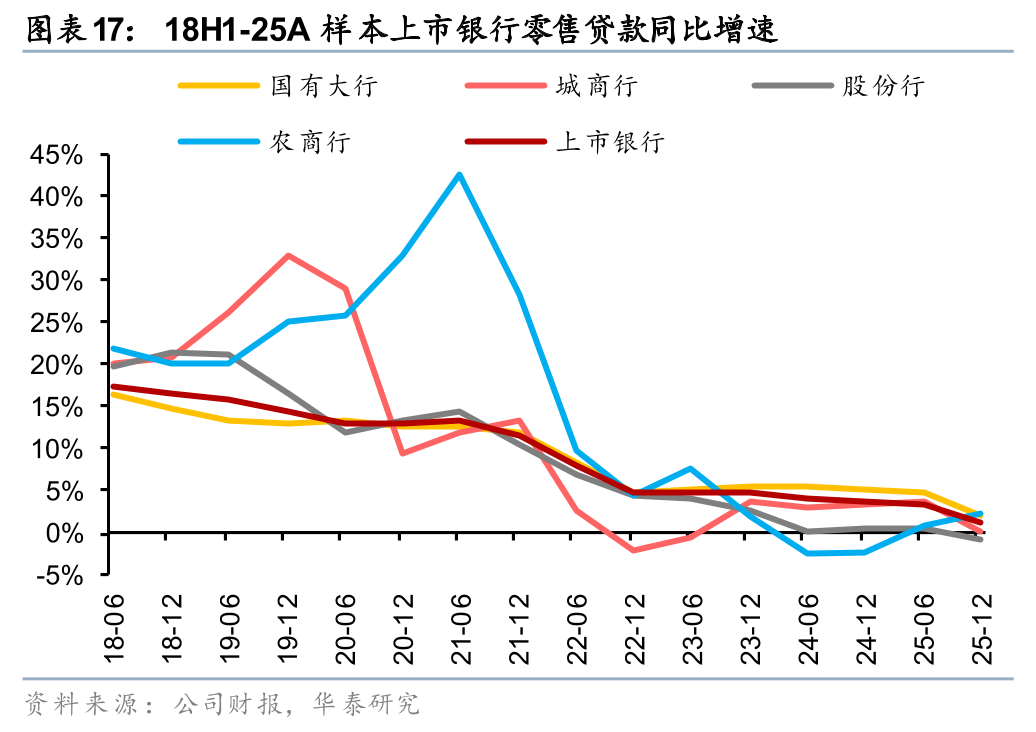 3)上市银行规模增长边际有所提速。2025年末样本上市银行总资产、总负债增速分别为9.1%、9.3%,增速分别较9月末 0.4pct、 0.5pct,规模扩张边际有所提速。资产端,信贷增速略有下滑,同业资产规模增速回正,金融投资资产增长降速。2025年末样本上市银行贷款、金融投资、同业资产增速分别为7.0%、13.5%、7.3%,增速分别较9月末-0.4pct、-1.9pct、 0.6pct。零售贷款投放继续承压,股份行受零售拖累较为明显。负债端,存款增长边际放缓,同业负债增速提升。2025年末样本上市银行存款、应付债券、同业负债增速分别为7.1%、3.1%、23.6%,增速分别较9月末-0.3pct、-6.3pct、 2.5pct。下半年对公活期存款流失提速,存款定期化趋势继续。