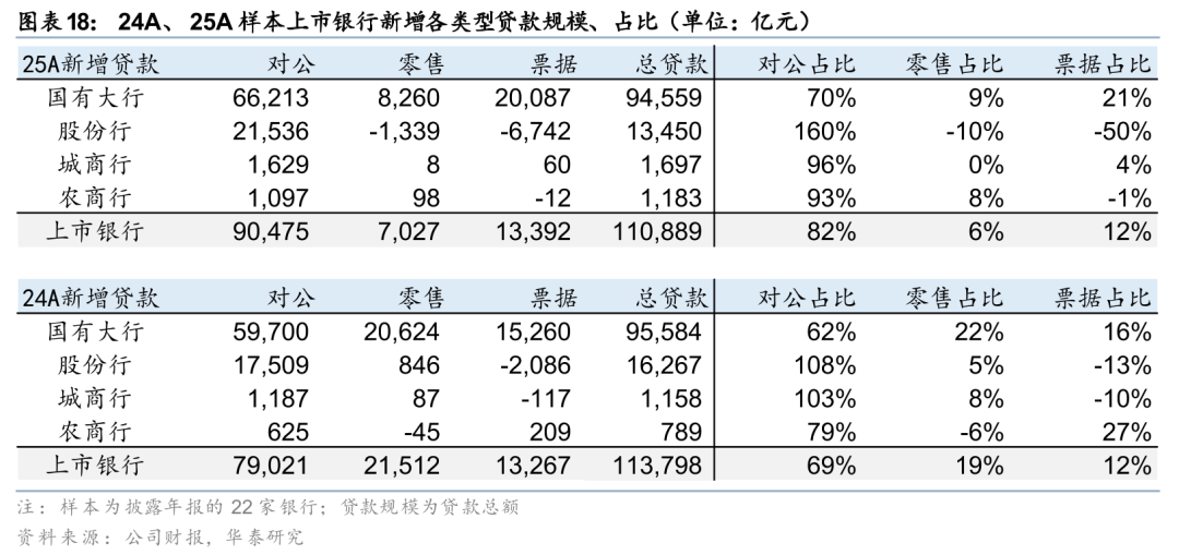 25年零售贷款投放继续承压,股份行受零售拖累较为明显。25年样本上市银行新增的11.1万亿贷款中,对公/零售/票据分别占比82%/6%/12%,对比 24年新增贷款结构中对公/零售/票据占比69%/19%/12%,零售贡献同比有所下降,主要由于行业需求持续偏弱、银行风控趋严。各类型银行中,股份行受零售拖累较为明显,25年新增贷款中零售占比-10%,较24年同期的5%显著下滑,浦发、兴业、民生等零售贷款负增较多。
