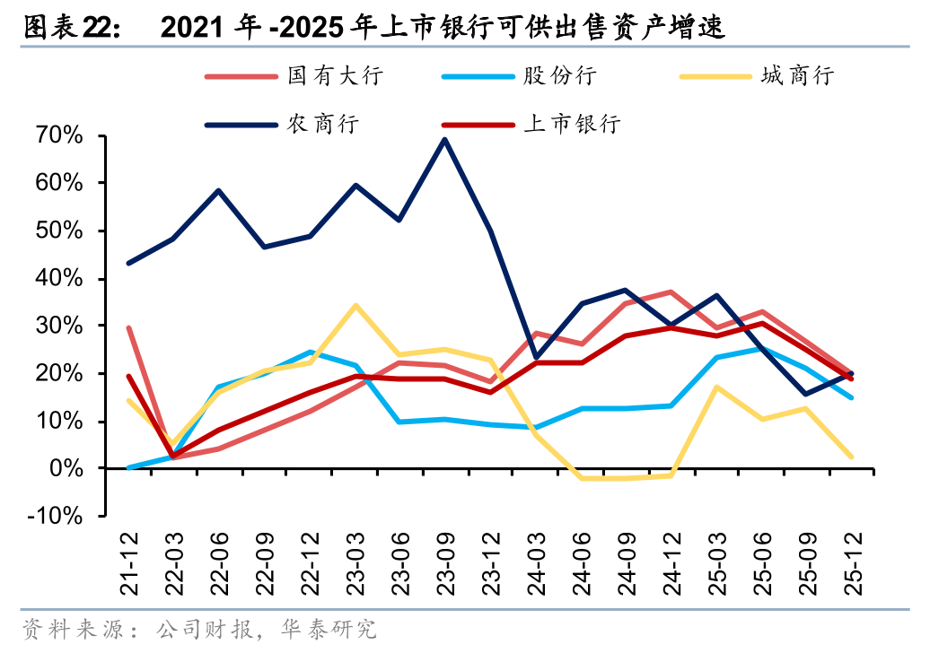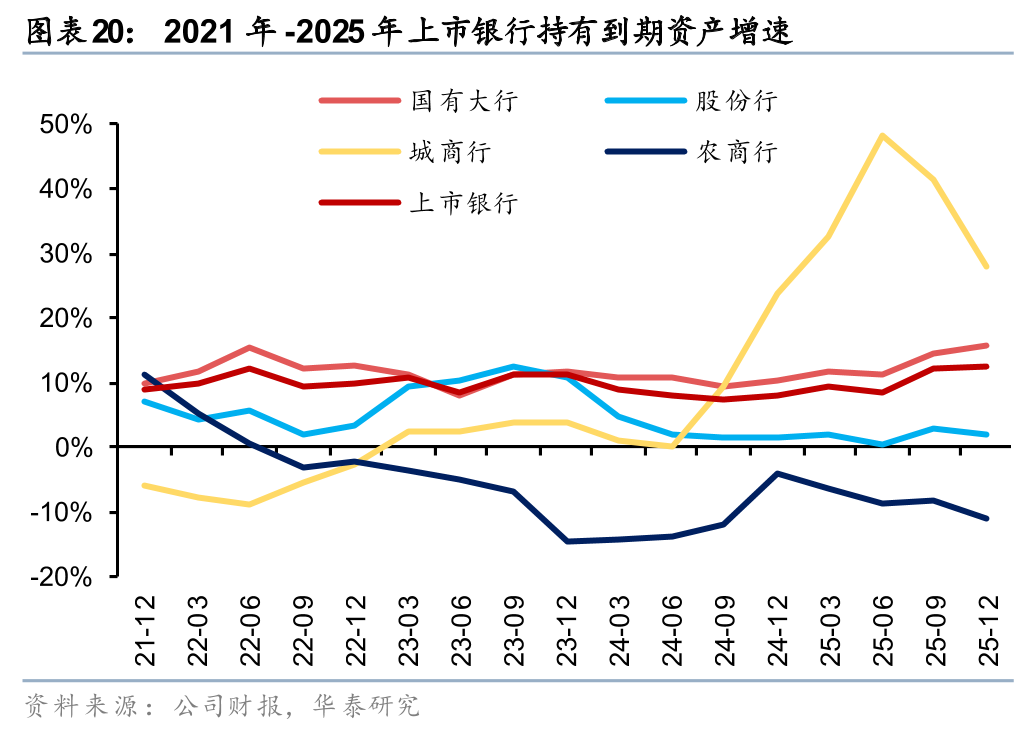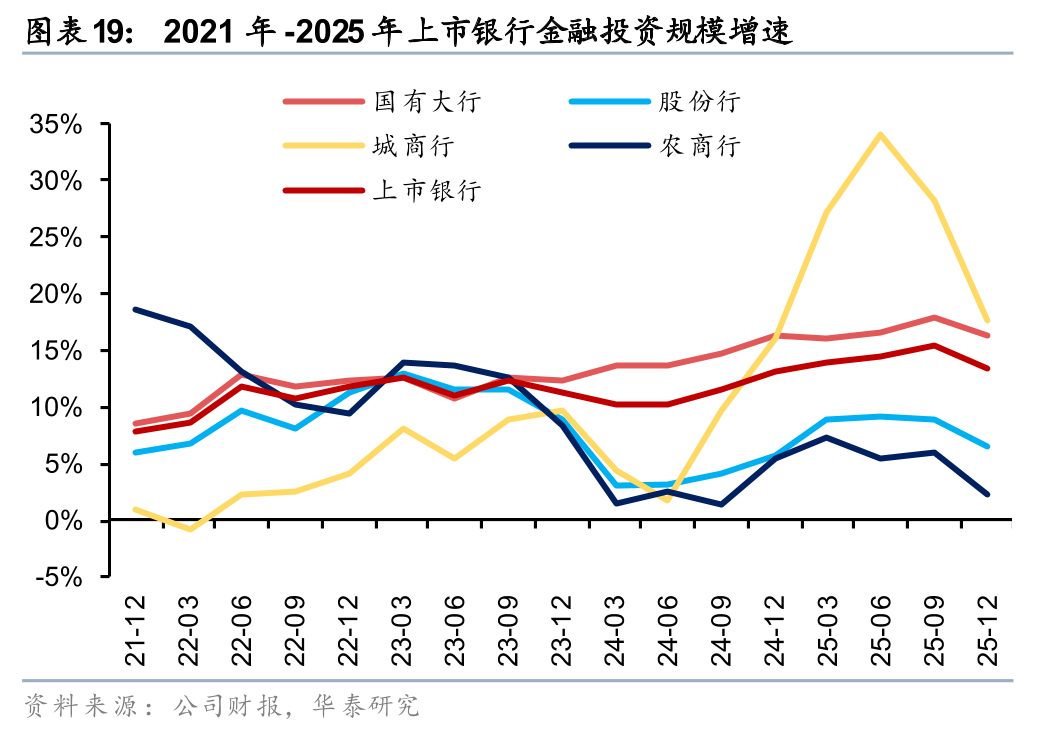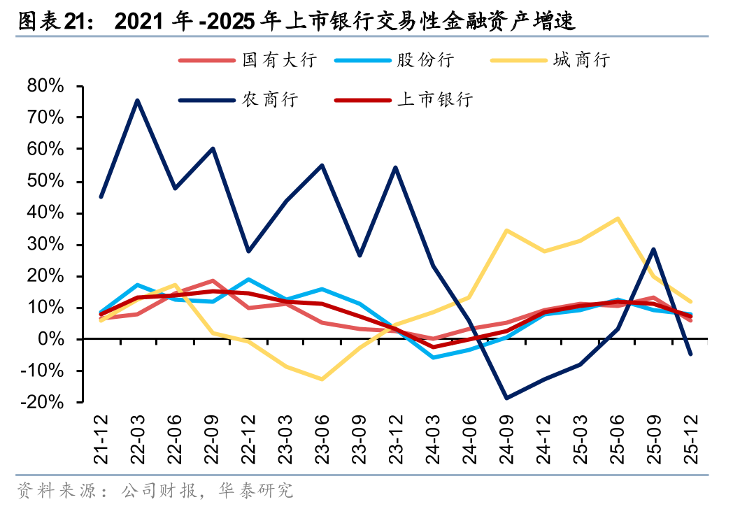 四季度金融投资资产规模扩张降速,OCI账户资产或被卖出兑现积累浮盈,平滑利润波动。25年末上市银行金融投资规模同比 13.5%,较9月末-1.9pct,金融投资资产扩张降速,或受下半年债市波动下银行卖出债券兑现浮盈驱动,银行增配债券放缓。分银行类型看,大行、股份行、城商行、农商行分别同比 16.2%、 6.5%、 17.7%、 2.3%,增速较9月末分别-1.6pct、-2.4pct、-10.6pct、-3.7pct,城商行降幅较大,但由于目前仅三家城商行披露年报,代表性或有限。拆分金融投资资产结构看,上市银行可供出售类金融资产账户(OCI)延续较高增速,同比 18.7%,增速较9月末-6.6pct,OCI账户资产或被减持用于兑现浮盈,以平滑25年利润波动。交易性金融资产、持有到期资产增速也有提升,分别同比 6.9%、 12.5%,增速较9月末分别-4.6pct、 0.5pct。