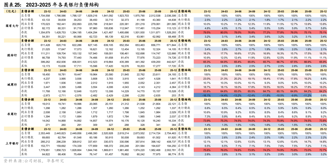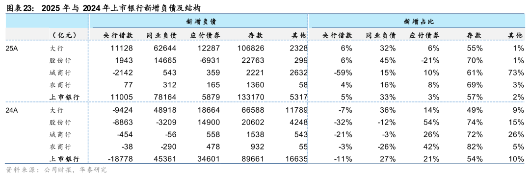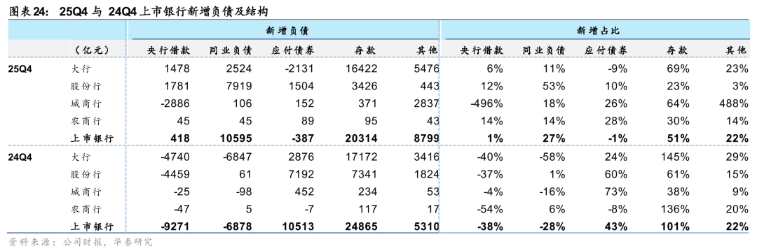 存款规模扩张,四季度边际放缓。25年样本上市银行总负债同比 9.3%,增速较24年末 2.2pct,较25Q3末 0.1pct。25年样本上市银行新增负债规模23.4万亿,同比多增6.6万亿,其中央行借款、同业负债、存款分别同比多增3.0万亿元、3.3万亿元、4.4万亿,应付债券同比少增2.9万亿元。四季度边际有所放缓,样本上市银行25Q4新增存款规模2.0万亿元,同比少增0.5万亿元,主要是股份行同比少增 0.4万亿元。