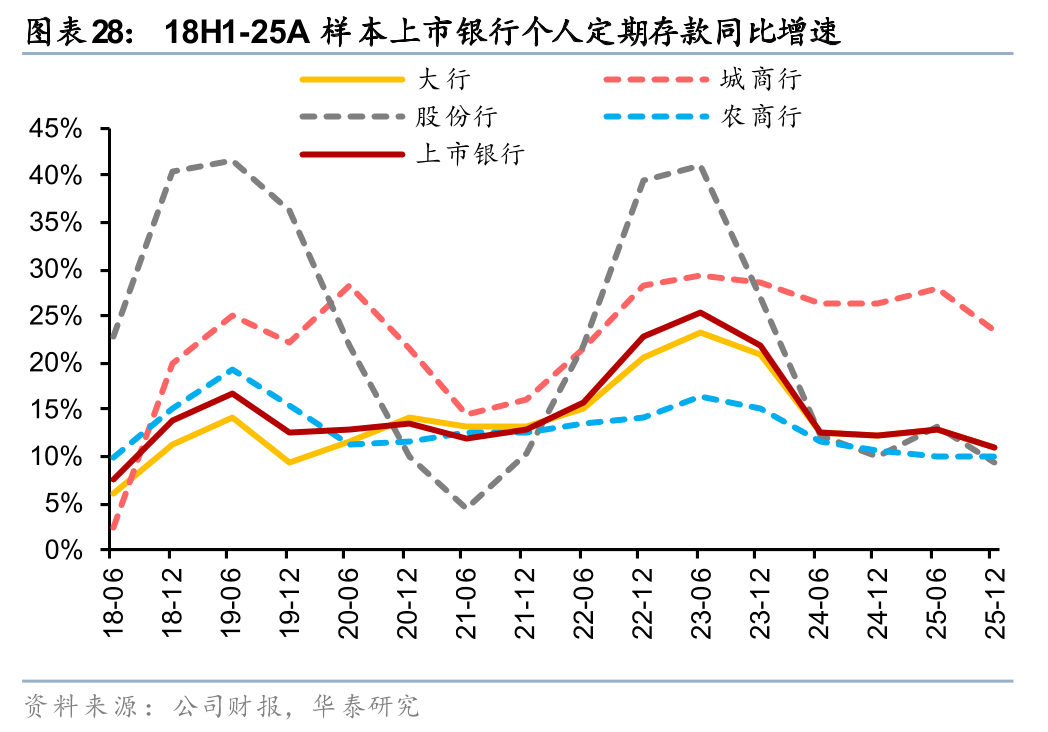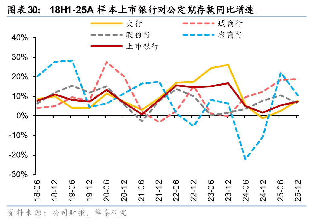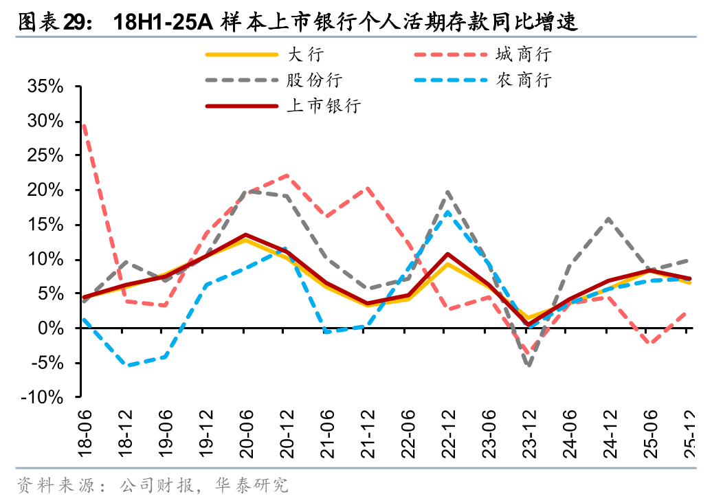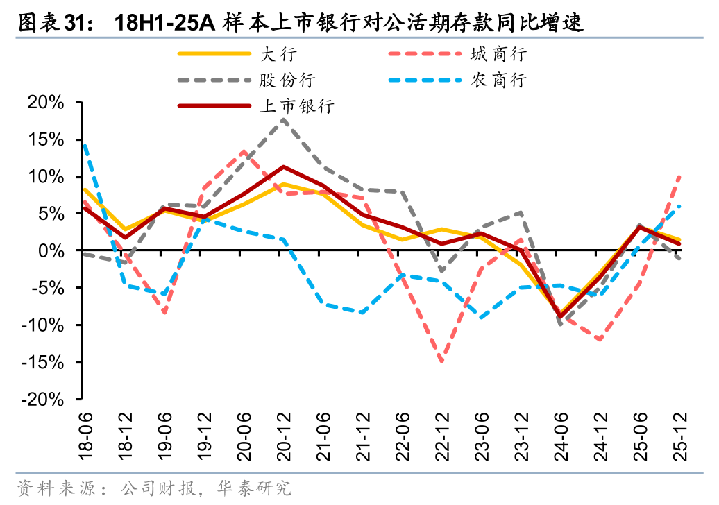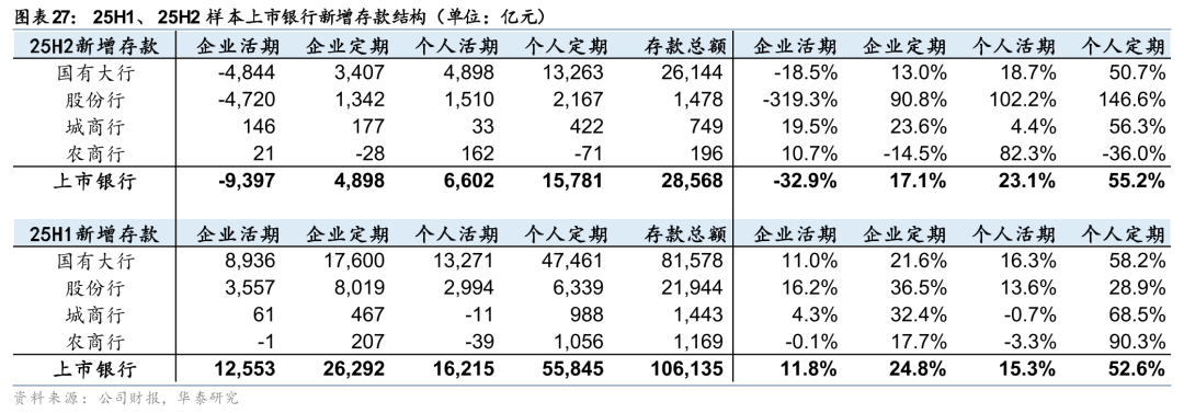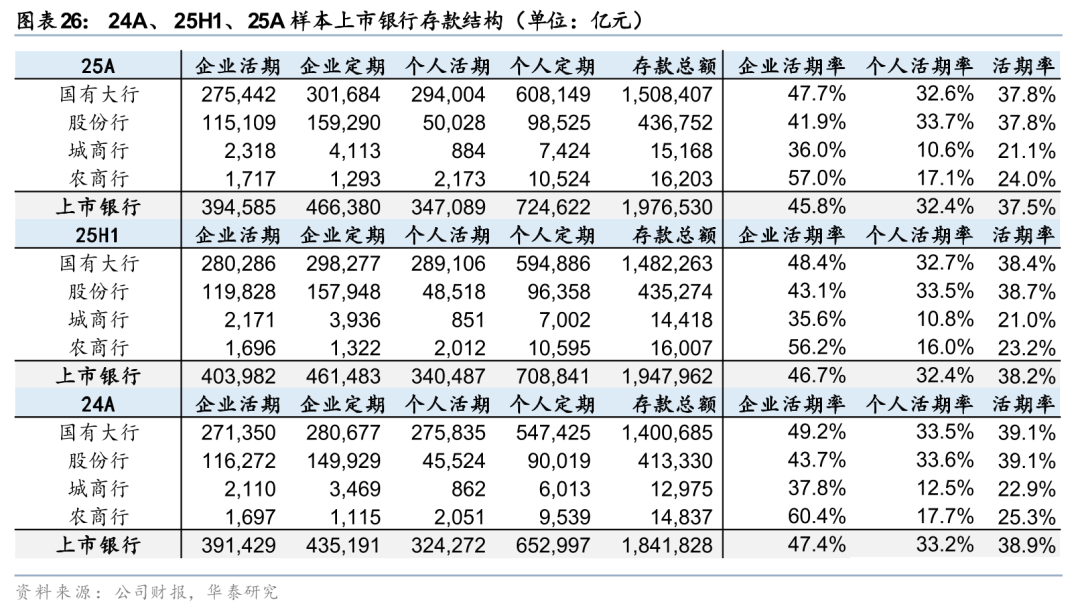下半年对公活期存款流失提速,存款定期化趋势继续。25年下半年样本上市银行新增存款2.9万亿元,其中企业活期、企业定期、个人活期、个人定期分别为-0.9万亿元、 0.5万亿元、 0.7万亿元、 1.6万亿元。较上半年而言,对公活期存款继续流失,企业存款活期率有所下降,较25H1-0.9pct至45.8%。其中主要是大行、股份行对公活期存款流失,下半年分别流失4844亿元、4720亿元。25年末样本上市银行总存款活期率为37.5%,环比25H1末下降0.7pct,定期化趋势继续。