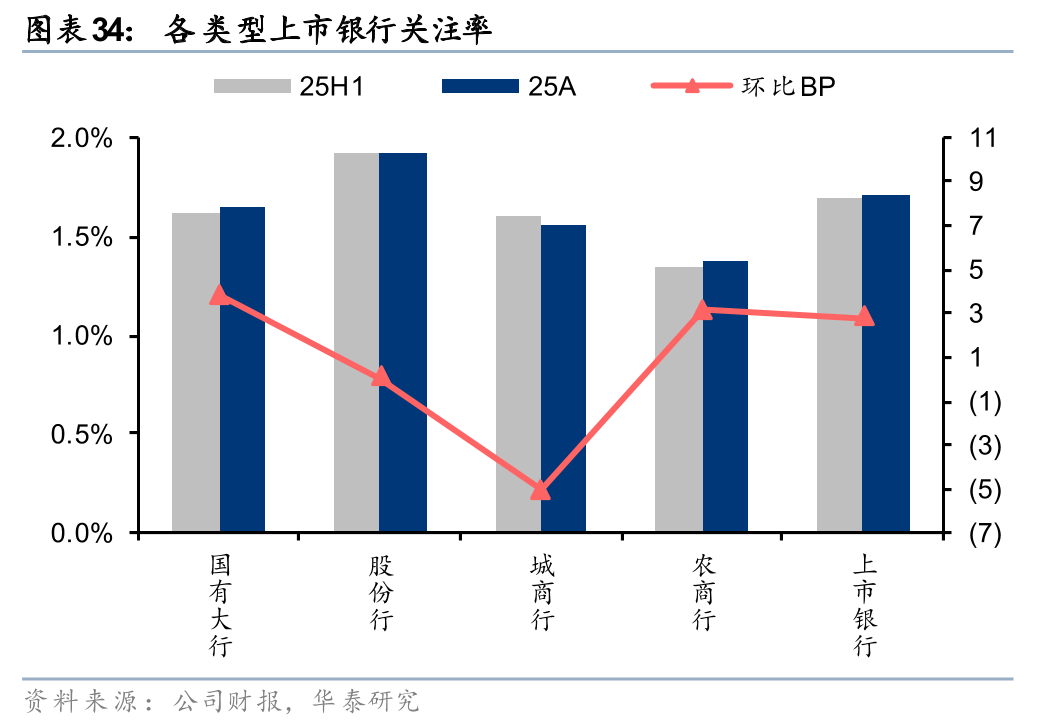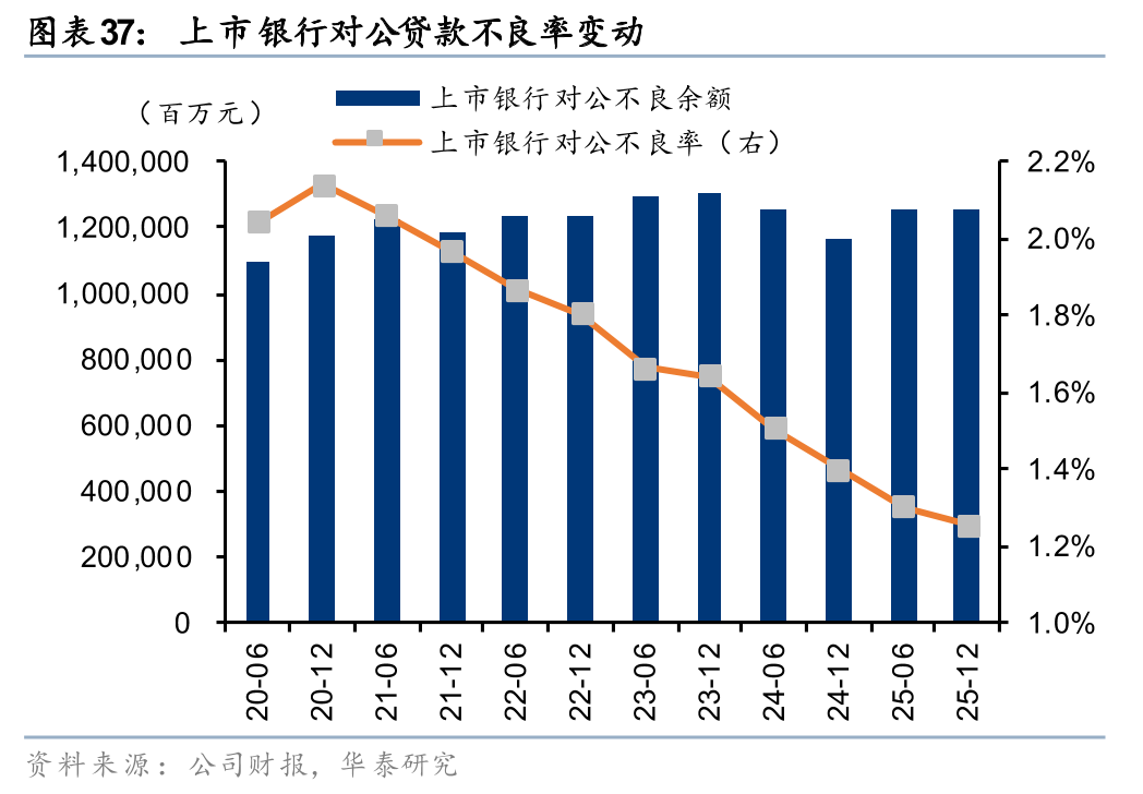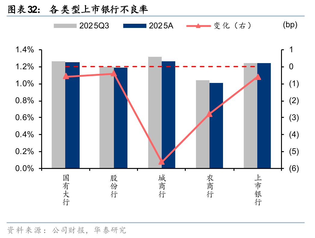对公贷款资产质量向好,对公贷款不良率环比下行。对公贷款方面,25年末上市银行对公贷款不良率较25H1末-4bp至1.26%,对公贷款资产质量整体稳中向好。25年末大行/股份行/城商行/农商行对公不良率分别较25H1末-7bp/ 4bp/-15bp/-8bp。