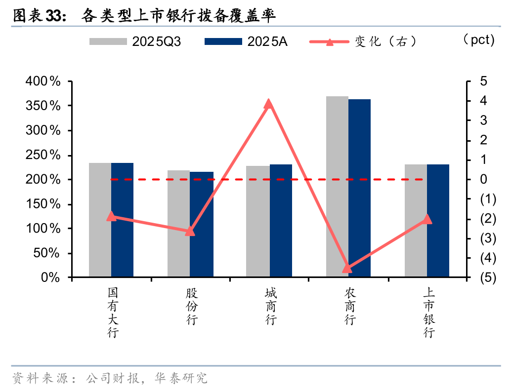 资产质量稳健,不良率延续改善,拨备率承压回落。2025年末22家已发业绩报告的上市银行不良率为1.24%,不良率较9月末-1bp,账面不良率维持稳健。分银行类型看,农商行不良率最低,大行、股份行不良率分别为1.26%、1.19%,较9月末-1bp、持平;区域行不良率降幅较大,25年末城商行、农商行不良率分别为1.26%、1.01%,较9月末-6bp、-3bp。2025年末22家上市银行拨备覆盖率230%,较9月末-2pct。分银行类型看,除城商行外,各类型银行拨备覆盖率均有所下滑,其中农商行拨备覆盖率边际下滑幅度最大,较9月末-4pct至364%,城商行拨备覆盖率较九月末 4pct至231%。