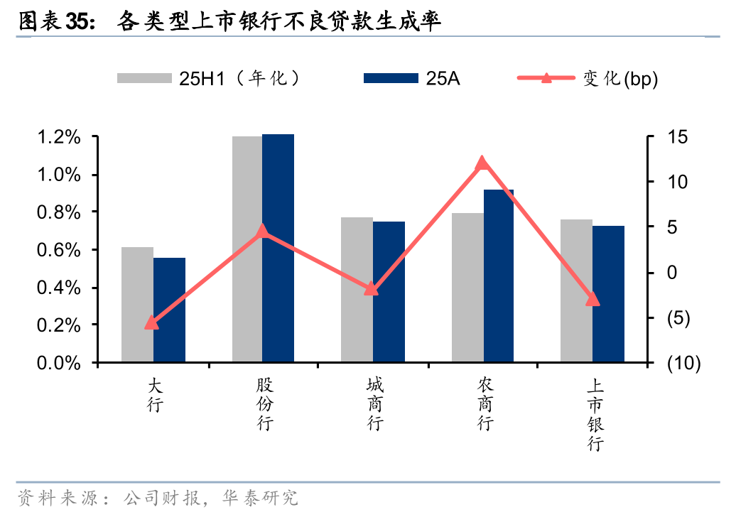 4)账面不良改善,但零售与房地产风险抬头。2025年上市银行账面资产质量整体稳健,不良率延续改善至1.24%,但隐性风险有所波动,关注率较上半年末微升3bp至1.71%。拨备覆盖率承压回落至230%,除城商行外各类型银行均出现下滑,其中农商行降幅最大。不良生成率整体降至0.73%,但内部分化明显:大行、城商行环比下降,而股份行、农商行分别上升4bp和12bp至1.24%和0.92%。为释放利润,全行业主动压降信用成本至0.64%,较上半年末下降14bp。分领域看,对公贷款质量向好,不良率环比下降4bp至1.26%,但房地产贷款不良率反弹40bp至4.37%,风险仍需关注。零售贷款成为主要压力源,不良率较上半年末提升14bp至1.38%,其中按揭和经营贷不良率分别上升11bp和13bp,反映出居民还款能力偏弱及小微企业经营承压。