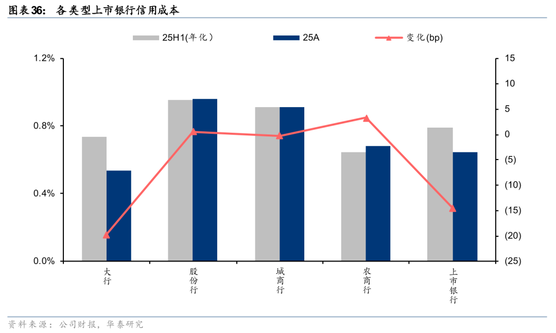 隐性风险指标波动,信用成本同比下行。25年末上市银行关注率为1.71%,较25H1末 3bp。25年末大行/股份行/城商行/农商行关注率分别较25H1末 4bp/持平/-5bp/ 3bp。25A上市银行不良生成率0.73%,较25H1环比-3bp,大行、城商行的不良生成率环比下降,股份行、农商行不良生成率环比上升。大行/股份行/城商行/农商行2025年末不良生成率分别环比25H1-6bp/ 4bp/-2bp/ 12bp至0.55%/1.24%/0.75%/0.92%。2025年上市银行信用成本0.64%,较25H1-14bp,驱动利润释放。分银行类型看,大行/股份行/城商行/农商行信用成本分别为0.54%/0.96%/0.91%/0.68%,分别同比-20bp/ 1bp/基本持平/ 3bp。