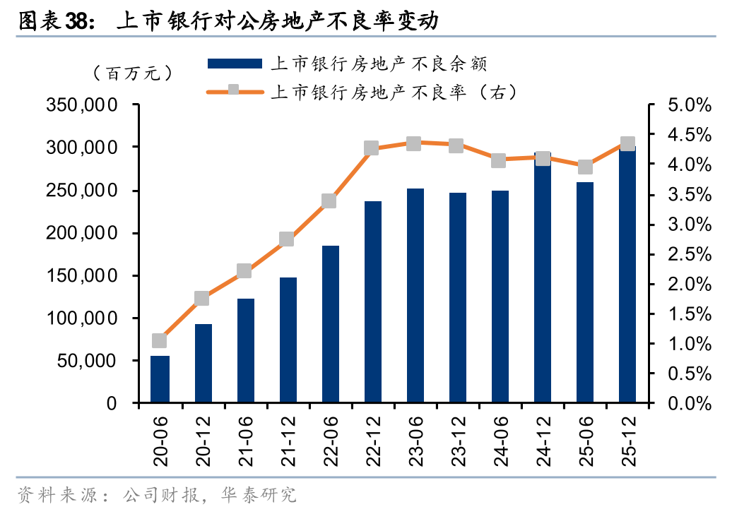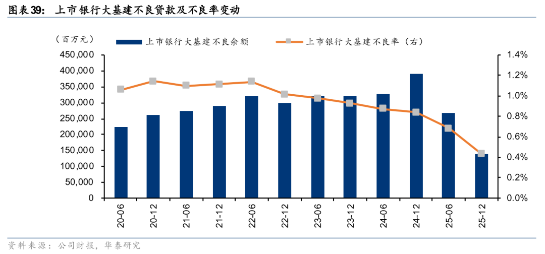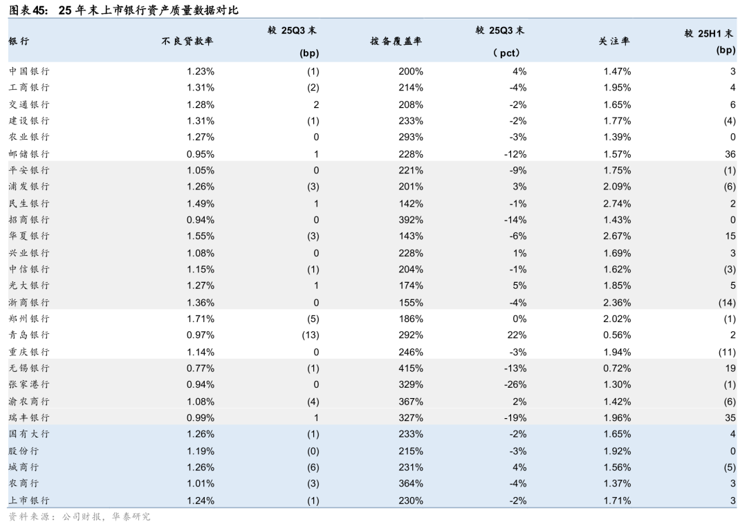 重点领域方面,房地产贷款资产质量略有下滑,整体风险可控。上市银行2025年末对公房地产不良率较25H1末 40bp至4.37%,房地产资产质量略有下滑,市场购房信心与资金面仍待进一步修复。防范化解重点领域风险工作取得阶段性突破,地方债务治理持续推进。2025年末上市银行大基建不良贷款率较25H1末-25bp至0.43%,地方隐性债务风险有序化解。2026年政府工作报告明确提出“深入实施一揽子化债方案,有序置换地方政府存量隐性债务,持续压减融资平台数量,地方债务结构不断优化”。