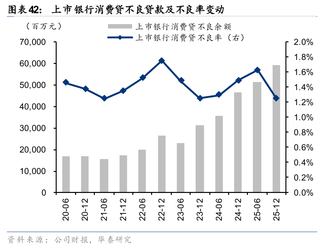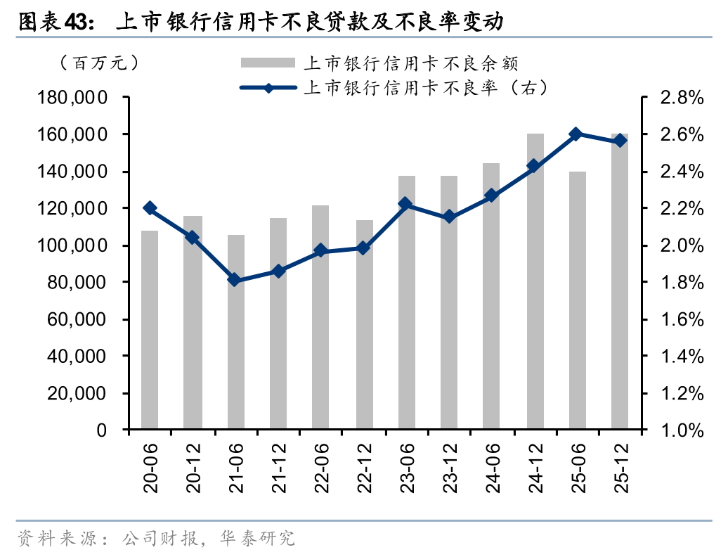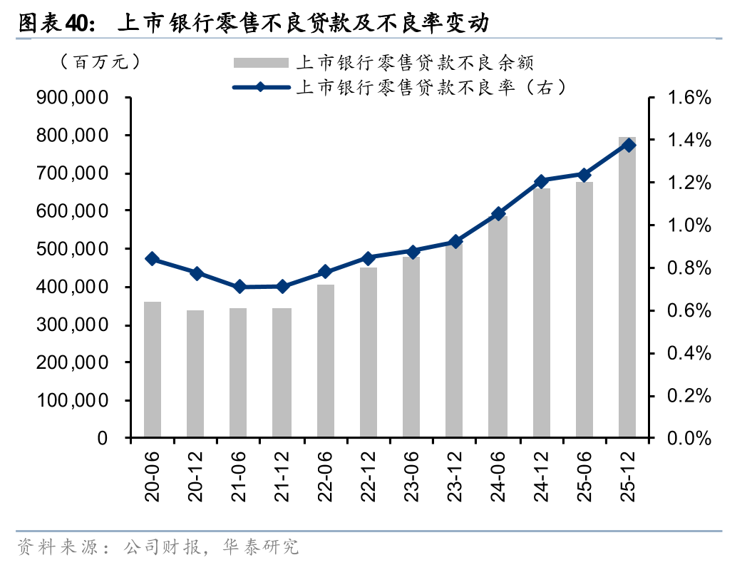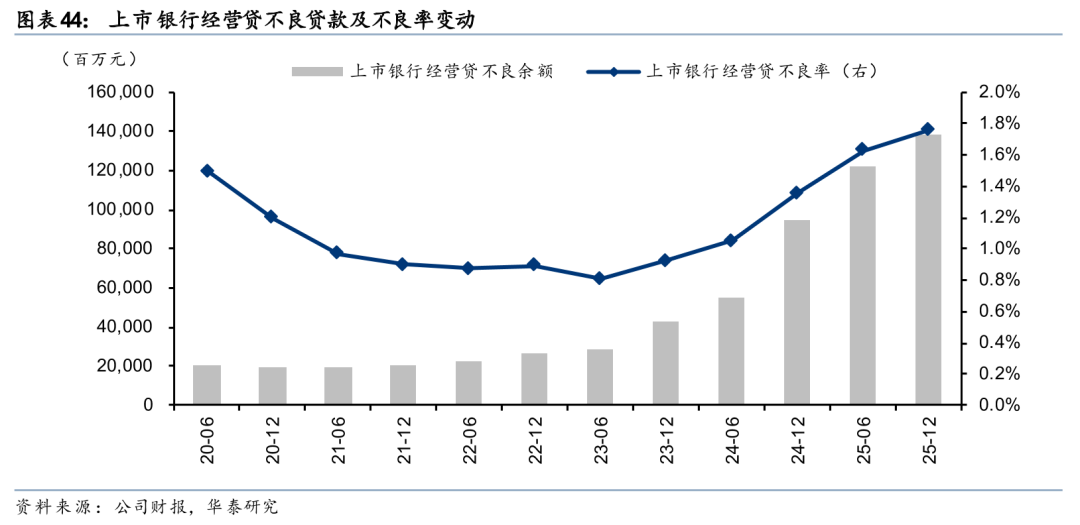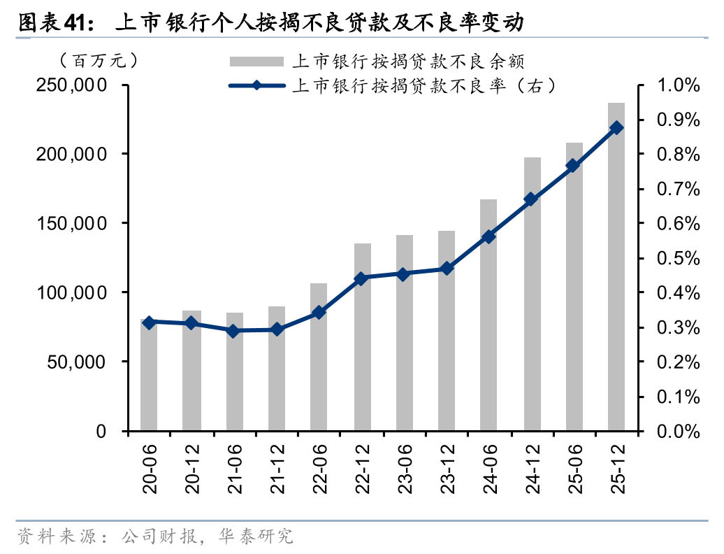 零售贷款资产质量整体波动,按揭和经营贷不良率边际提升。2025年末上市银行零售贷款不良率较25H1末提升14bp至1.38%,其中按揭贷款不良率较25H1末提升11bp至0.88%。按揭不良率提升一方面由于房价波动、部分贷款LTV较为承压,另一方面由于购房者收入现金流压力提升。25年末上市银行消费贷、信用卡、经营贷不良率较25H1末分别-37bp、-4bp、 13bp至1.25%、2.56%、1.76%,主要由于居民收入能力有待提振以及小微企业经营状况较有压力。