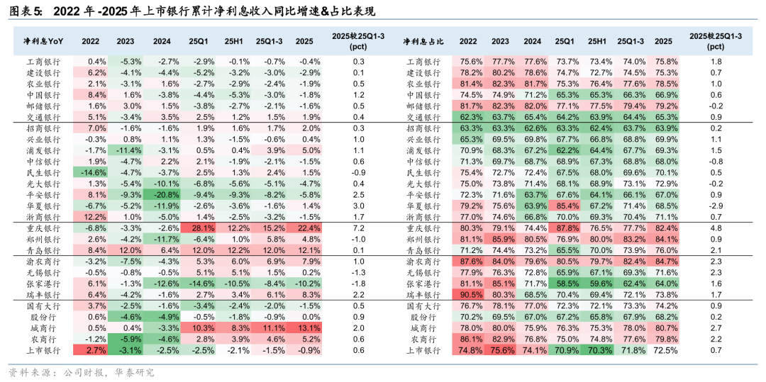 四季度息差降幅收窄带动净利息收入降幅收窄。2025年22家样本上市银行净利息收入同比-0.9%,较1-9月 0.6pct,大行、股份行、城商行、农商行净利息收入分别同比-1.5%、 0.0%、 13.1%、 5.2%,较前三季度分别改善0.5pct、0.9pct、2.0pct、0.6pct。重庆银行、青岛银行净利息收入保持较快增速,同比 22.4%、12.1%,主要由于区域增长红利下规模快速扩张、息差逆势趋稳。2025年上市银行净利息收入占营收比例较1-9月小幅提升0.7pct至72.5%,为营业收入主要来源。