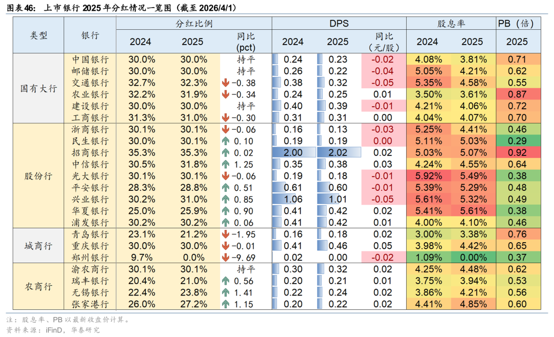 上市银行分红比例整体稳中有升。从每股股利维度,目前披露年报的22家上市银行中,12家上市银行25年每股股利同比持平或微升。从分红比例维度,14家上市银行25年分红比例持平或同比提升。无锡银行、张家港行和中信银行25年现金分红比例提升幅度较大,分别同比 1.41pct/ 1.15pct/ 1.25pct至23.8%/27.2%/31.8%;郑州银行分红比例同比下行幅度较大,主要因25年未进行分红而变动明显。