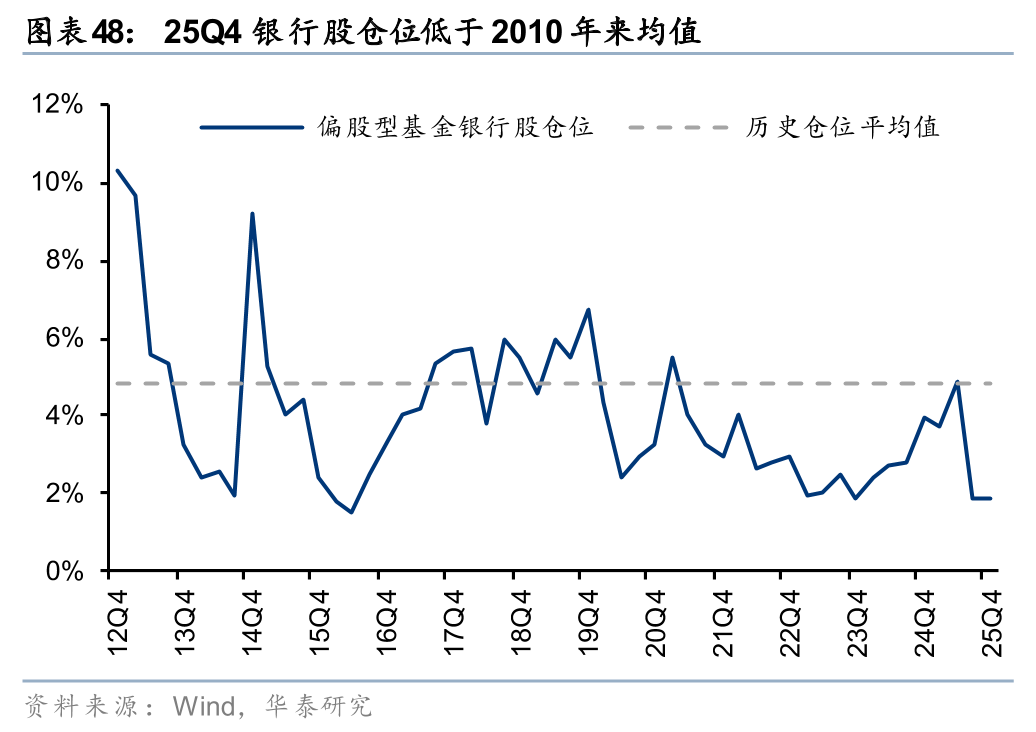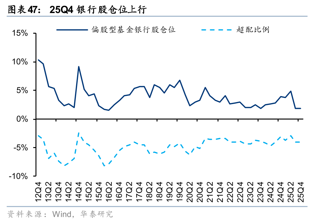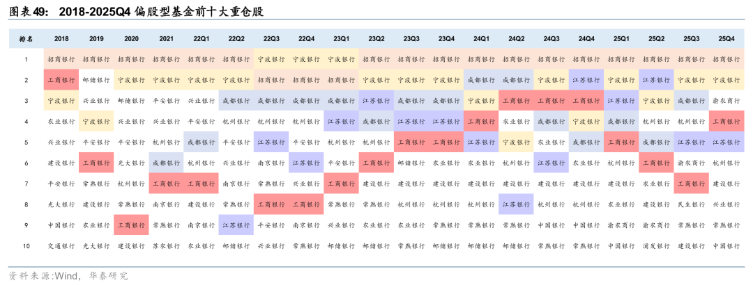 基金所持银行仓位边际上行,环比回升。从银行股整体持仓情况看,25Q4银行股仓位环比小幅提升,除城商行仓位继续下行,大行、股份行、农商行仓位均回升。25Q4银行股占偏股型基金仓位为1.89%,较25Q3上升0.04pct,边际小幅增长,大行、股份行、城商行、农商行仓位分别环比 0.08pct、 0.02pct、-0.06pct、持平至0.32%、0.60%、0.78%、0.19%。从个股持仓看,37只重仓股中18家被减持,按市值变动计算,成都、民生被减持较多,中行、建行、兴业、宁波等获增持。Q4末招行、江苏、杭州个股仓位分别较Q3 0.01pct、-0.02pct、-0.04pct。从机构持仓集中度情况看,25Q4银行股中前三大重仓股占银行股仓位的集中度为46.0%,较25Q3 0.28pct。