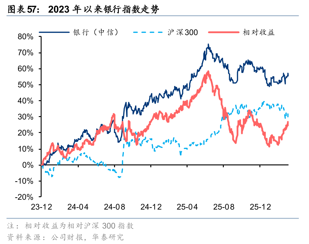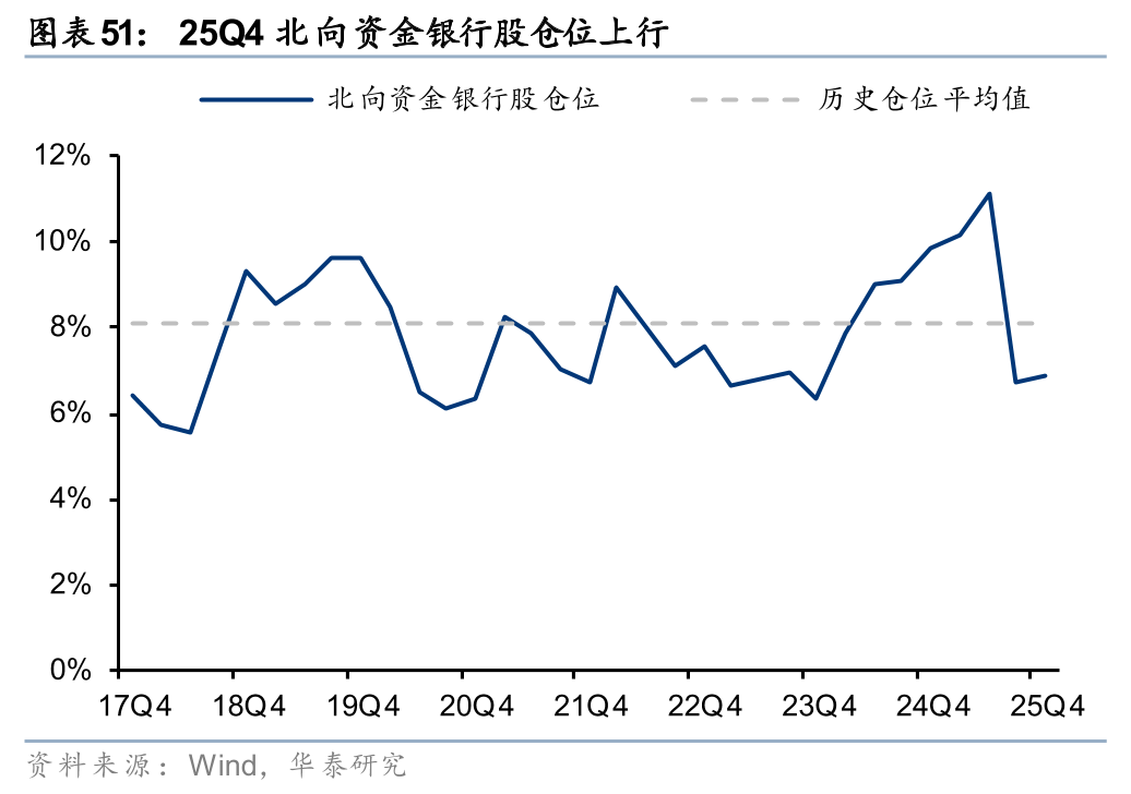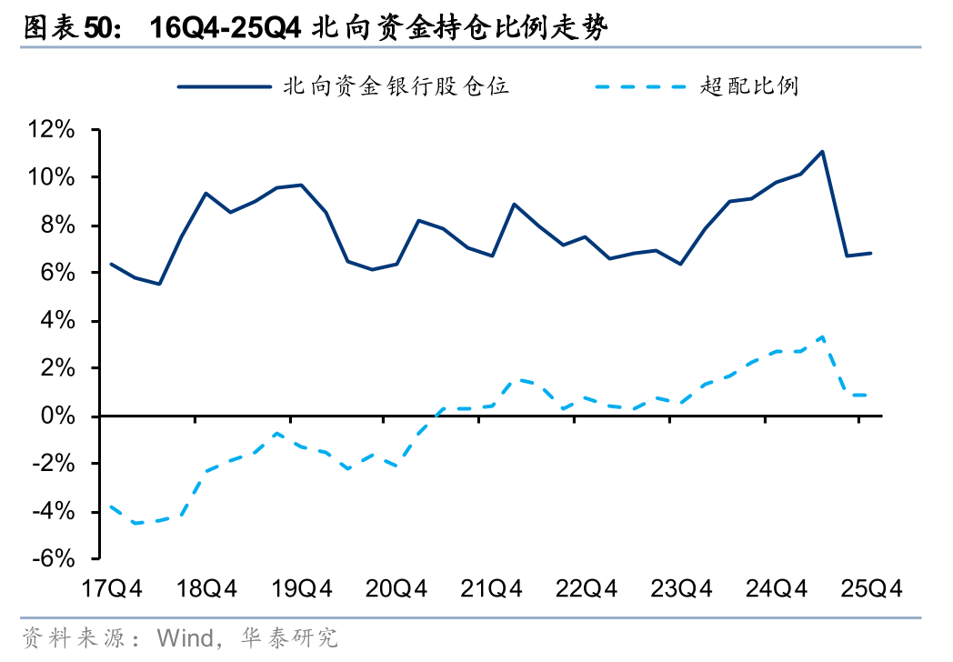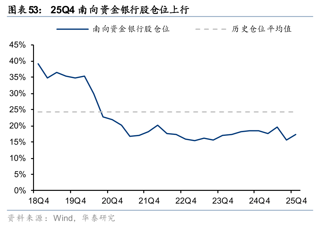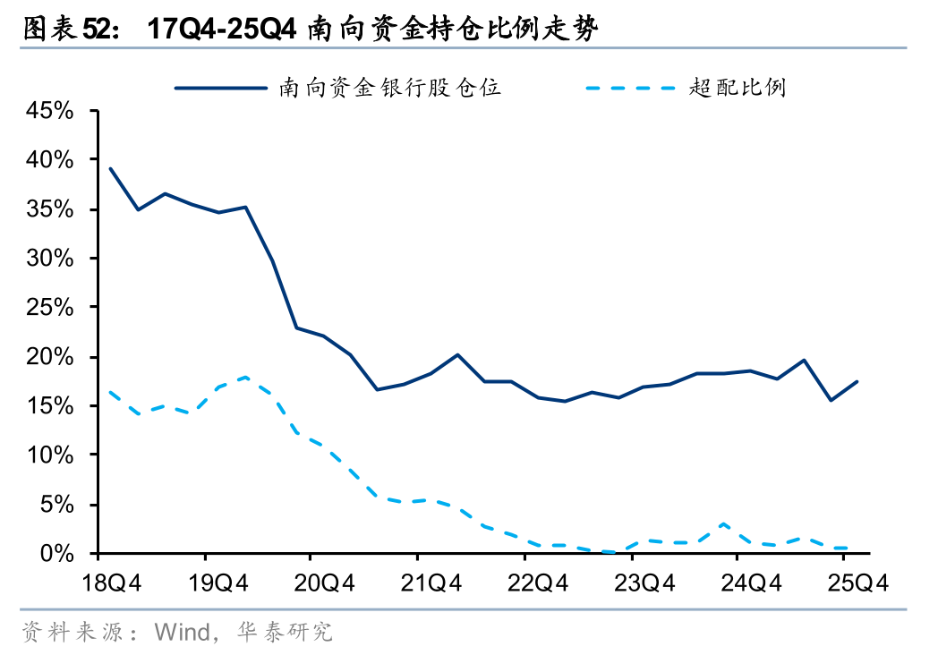 25Q4南北向资金仓位均边际上行。从银行股整体持仓情况看,25Q4北向持仓银行1772亿元,较25Q3增加34.66亿元。其中资金流入较多的为招行、工行、宁波、农行等。25Q4南向仓位也有所上行,工行、汇丰控股、招行等获较多资金增持,而民生银行被减持较多。25Q4北向/南向资金银行股仓位分别为6.8%/17.4%,北向/南向资金银行股仓位超配比例分别为0.9%/0.6%。从个股持仓看,25Q4北向资金持仓前三依次为招商银行、工商银行、兴业银行,南向资金持仓前三依次为建设银行、工商银行、汇丰控股。从持仓集中度看,25Q4银行股北向前三大重仓股市值占比分别为44.1%,集中度有所上行;25Q4银行股南向前三大重仓股市值占比分别为62.3%,集中度小幅下行。