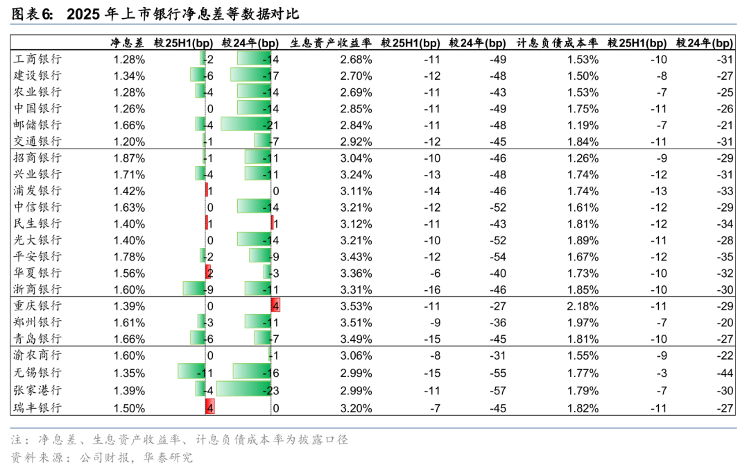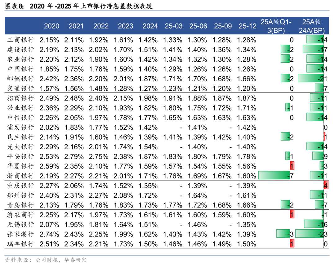 1)四季度样本上市银行净息差边际企稳,预计2026年息差企稳拐点可期。已披露年报的上市银行累计净息差为1.40%(测算值),较1-9月-0.3bp,负债成本优化显效,对冲息差降幅,2025年样本上市银行累计付息负债成本率为1.58%,较1-9月-3bp(较24年全年-36bp)。息差降幅收窄带动净利息收入有所回暖。样本上市银行净利息收入同比-0.9%,较1-9月 0.6pct,重庆银行、青岛银行净利息收入保持较快增速,同比 22.4%、12.1%,主要由于区域增长红利下规模快速扩张。