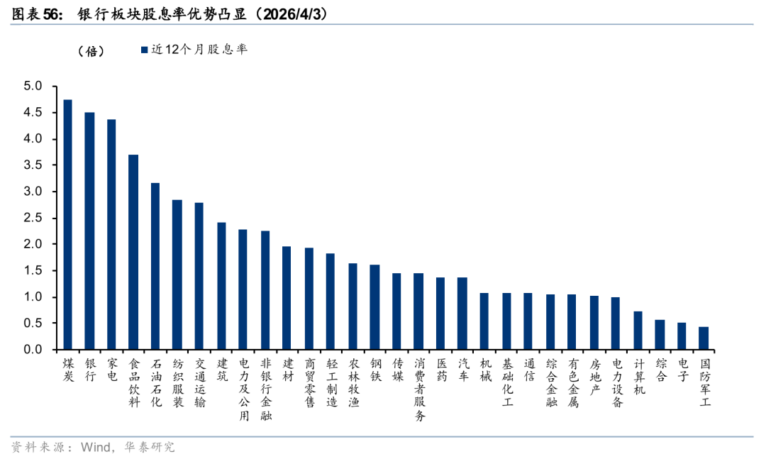估值2010年以来低位,股息率优势显著,配置性价比高。纵向看,截至2026年4月3日,银行板块PB(lf)估值为0.67倍,位于2010年以来23.2%分位,处于较低水平。横向看,当前银行板块PB(lf)位于Wind30个行业(一级行业)末尾。板块估值、仓位均处于历史较低水平,关注稳增长政策出台。截至4月3日,A股银行板块近12个月股息率4.51%,银行股息率优势显著,配置价值凸显,对于险资、外资等追求高股息、高稳定度的机构投资者具有较强吸引力。