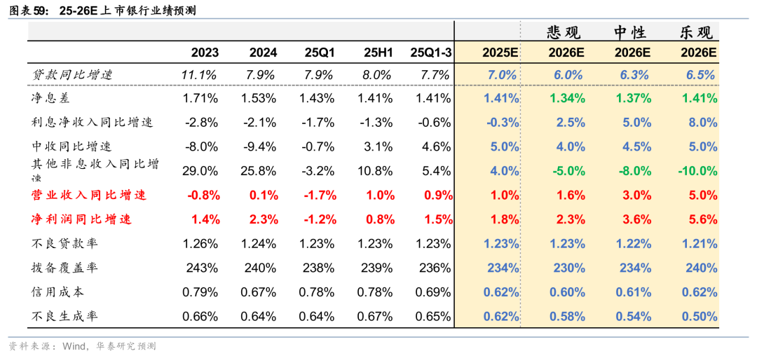 3) 中收方面,银保费率调整压力逐步消化,25Q3以来资本市场表现较好,预计财富管理业务有望逐步修复,中收增速低基数下稳步增长,预计中性情况下26E中收增速4.5%。