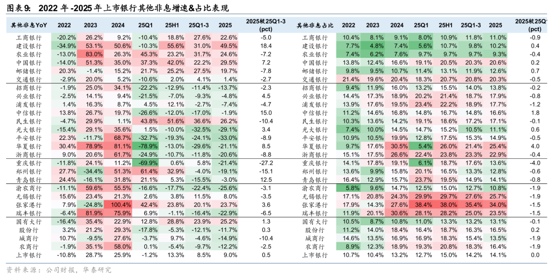 其他非息收入仍为营收重要驱动力,但增速有所分化。从全年数据看,上市银行整体其他非息收入同比 9.0%,较1-9月 0.5pct,主要为大行带动。2025年整体债市走势较为波动,公允价值变动损益均有一定承压,但大型银行通过适当兑现浮盈,实现非息收入的平稳增长。大行、股份行、城商行、农商行其他非息分别同比 25.2%、-11.7%、-14.9%、-12.2%,较1-9月分别 1.3pct、 0.3pct、-10.4pct、-2.5pct。其他非息收入占营收比例基本持平于14.1%,其中股份行、农商行占比相对较高,为16.5%、16.4%。