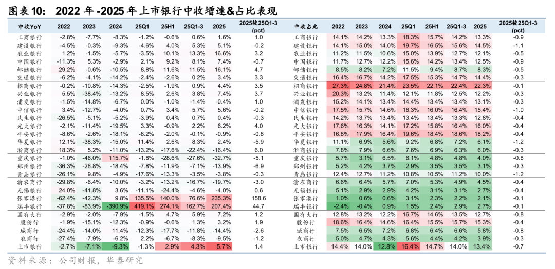 中收同比增速逐步回暖,大行、股份制银行修复幅度更高。2025年22家已披露业绩上市银行中收业务同比 5.7%,增速较1-9月上升1.4pct,增速逐季回暖。中收占比同比提升0.6pct至13.4%。大行中收同比 7.2%,增速相对较大。如果2026年资本市场持续活跃,理财、投行等中间业务收入增速有所支撑,预计中收有望持续稳步修复,综合化经营趋势下子公司牌照齐全的银行更具优势。