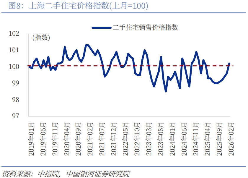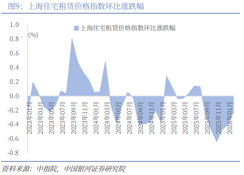 二手房价格环比修复、租赁价格降幅收窄。从房价指数看,2026年2月,上海二手住宅销售价格指数实现环比提升。以上月=100,2026年2月该指数为100.2,是2025年5月以来首次指数超过100,即首次实现二手住宅销售价格指数环比提升。从租金表现看,2025年12月-2026年2月,租赁价格环比降幅逐渐收窄,2026年2月该降幅为0.23%。