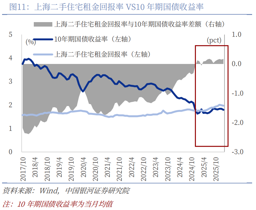 租金收益率已连续高出10年期国债收益率。根据中原地产数据,上海整体的租金回报率于2025年12月达到2.01%,是2016年1月后首次突破2%,2026年1-2月租金回报率维持在1.95%以上。从收益率的相对表现看,2025年4月以来上海二手住宅租金收益率即持续高于10年期国债收益率,并且收益率差额逐渐稳定在0.14pct以上。