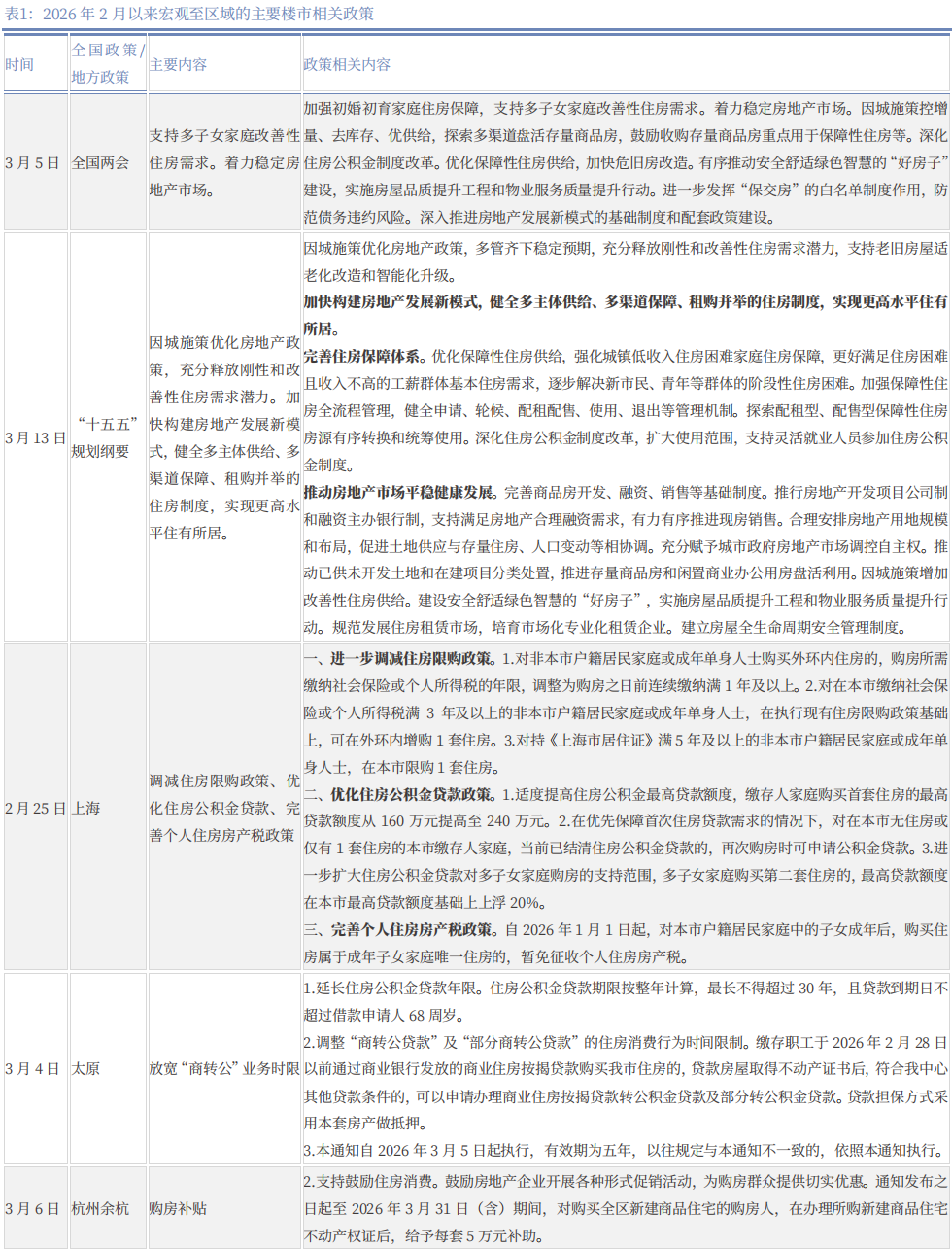 2025年末中央经济工作会议中提到“着力稳定房地产市场,因城施策控增量、去库存、优供给”,2026年1月以来,各地陆续出台适宜当地的支持政策,因城施策支持楼市发展。一线城市中,上海率先于2026年2月先后出台试点收购二手房、“沪七条”政策,从库存、需求、公积金等多维度支持楼市稳定发展。二线城市中,南京落地房贷贴息政策。其他核心城市中,杭州、成都等地同样陆续出台公积金放松政策降低居民购房成本。
