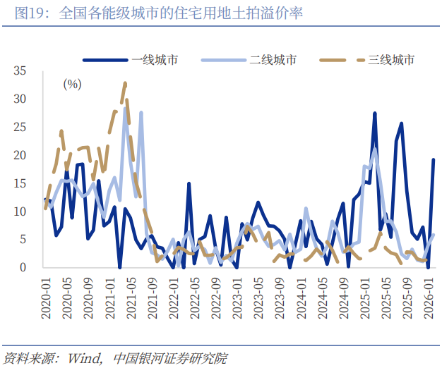 一线城市土拍热度率先回暖。我们观察到全国百城中,一线城市土拍溢价率率先提高,2026年2月住宅用地土拍溢价率达到19.21%,二线城市自2025年12月住宅类土拍溢价率逐渐提高,2026年2月稳步提高至5.86%,三线城市在近3个月内维持在1.5%以内。