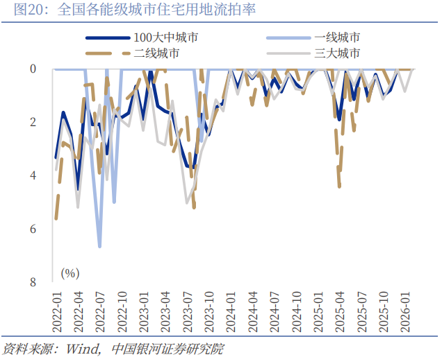 一线城市土拍参与度高,二线城市热度逐渐修复。我们观察到2023年10月以来一线城市的住宅用地流拍率持续为0,表明房企持续认可一线城市的土地价值。二线城市自2025年12月以来,连续3个月住宅类用地流拍率为0。土拍参与度与各地所供的住宅地块本身的区位、容积率等因素关联度较高,二线城市流拍率降低间接表明各地推地质量提高,同时表明房企对相应地块信心抬升。三线城市依然存在流拍现象,目前各能级城市依然呈现高能级城市与低能级城市土拍热度显著分化的态势,与我们上文所提的区域间分化基本一致。