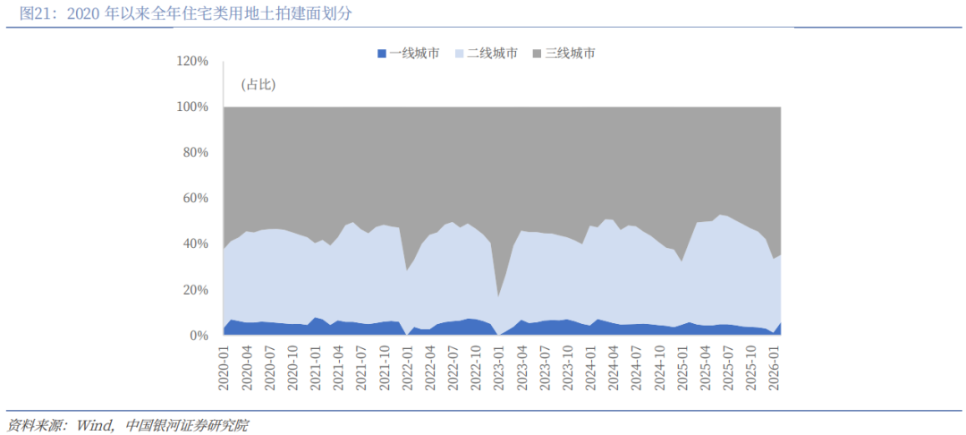 高能级城市土拍占比扩大。尽管核心城市更具土拍吸引力,但核心城市数量有限,导致供应地块规模相对少于低能级城市,因此从土拍占比看,低能级城市占比依然较高。截至2026年2月,全国百城住宅类用地中,一、二线城市土拍建面占比提高至35.26%。随着楼市成交逐渐企稳,核心城市的土拍占比有望进一步提高。
