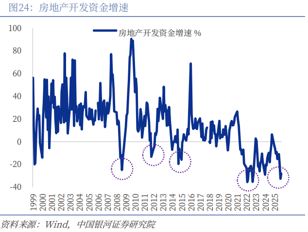 房地产开发在固定资产投资比重创历史新低。2025年末,房地产开发占固定资产投资完成额比重录得17.06%,创出历史新低,低于2016年末的17.2%的占比,已低于上一轮调整周期的最低点。