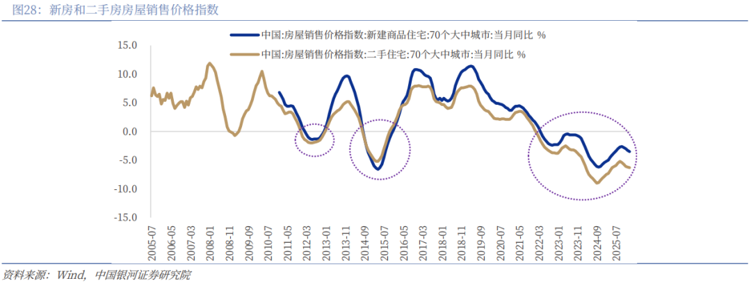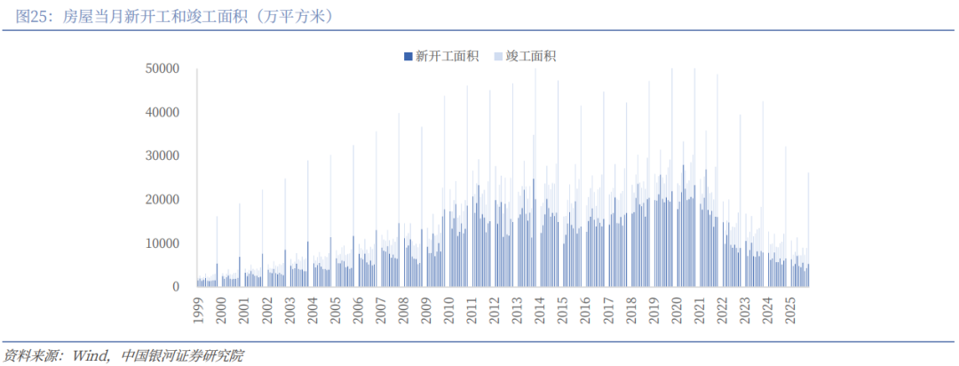 房地产供给端已经过比较深度的收缩,这有利于新的供需平衡的形成。从房地产产业链来看,供给端呈现较为深度的收缩,新开工意愿自2021年开始明显走弱且持续下滑,这意味着从中期来看,房地产的新增供给将保持在低位。2025年的10月当月新开工面积仅为3662万平方米,比2020年同期下滑了约82%,仅相当于上一轮调整周期的2015年同期的约三分之一,绝对值几乎回到了2003年的同期水平。