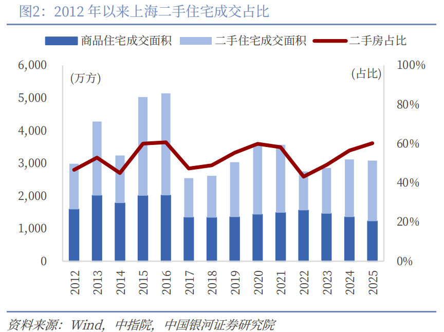 2005年以来,上海的城镇常住人口占比维持在89%左右的水平,2020年以来城镇人口维持在2200万人左右的水平。城镇化水平和城镇常住人口的发展相对稳定。在成熟市场中,二手房市场发展相对较高,并已成为上海住宅成交的重要组成部分。2025年,上海二手住宅成交1860万方,已占上海住宅总成交面积的60.30%,2016年后首次突破6成。
