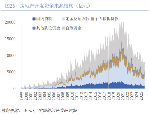 房地产开发资金结构也出现了变化,居民杠杆明显下降。从2021年开始,房地产开发资金组合中,居民个人按揭贷款的占比呈现下行,居民在房地产的杠杆水平趋于下降,居民中长期贷款出现负增长。