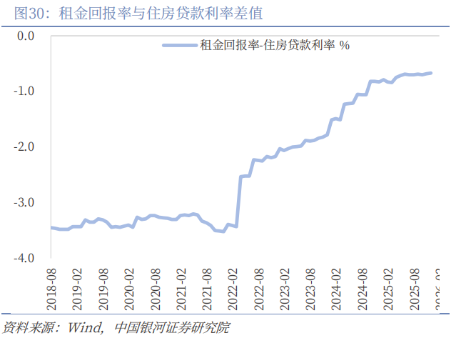 2021年开启的房地产下行周期,在经历了将近5年较为深度的调整之后,已出现“性价比”。房价的下跌被动推升了租金回报率,租金回报率渐渐超出了无风险回报率,同时租金回报率也在逐渐接近住房贷款利率。从2023年年末开始,百城租金回报率持续高于5年定期存款利率。同时,从2024年7月起,百城租金回报率持续高于10年期国债收益率。截止2025年末,百城住宅租金回报率为2.39%,与个人住房贷款利率的差额已收窄至67BP。