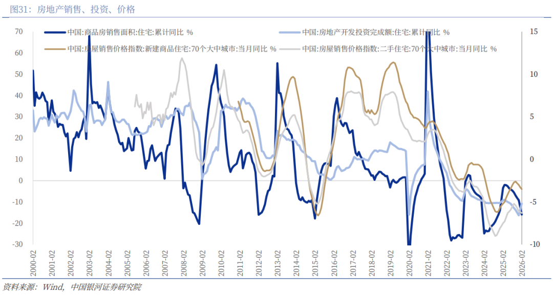 观察历史房地产复苏周期,传导链条为二手房销量回暖→新房销量回暖→房地产投资企稳→房价企稳。2026年春节后,一方面观察到一线城市二手房销量已呈现回暖迹象,是一个积极信号。另一方面,目前房地产投资仍在触底阶段,房价也仍然延续回落。如果目前一线城市二手房销售的回暖可以向更多城市和新房扩散,传导至投资意愿的企稳,并最终带动房价的触底回升,将结束房地产下行周期,迎来复苏。