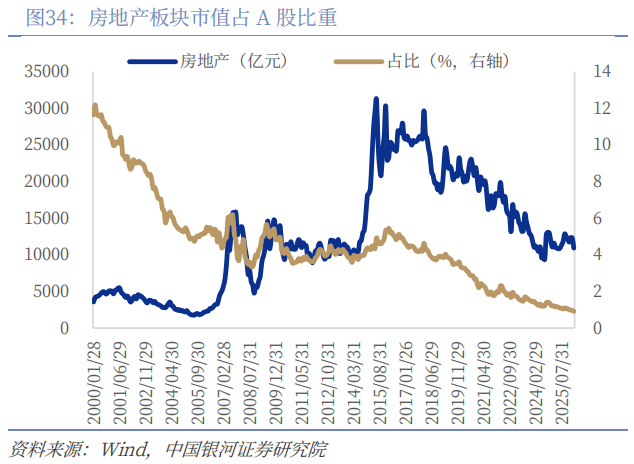 从市场结构看,房地产板块在A股中的市值占比经历了先降后稳再降的过程。2005年后地产公司陆续登陆资本市场,房地产板块市值快速扩张的同时占A股的比重逐渐企稳,2010年前后达到阶段性高位近5%。此后随着行业调控加强以及经济结构转型推进,房地产在资本市场中的市值与权重逐步回落,行业对股票市场整体盈利与估值的影响力也随之下降。