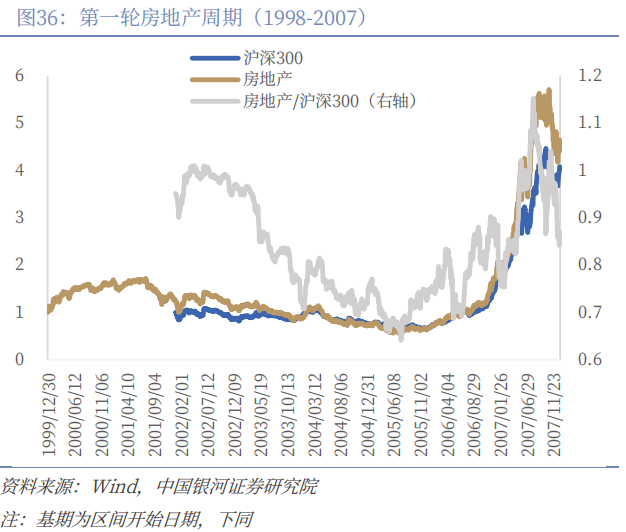 第一轮房地产周期(1998—2007年)以制度红利驱动为主,地产股与大盘呈现高度同步的Beta行情。1998年城镇住房制度改革正式启动,住房分配货币化标志着房地产市场化进程的开始,房地产开发迅速成为推动中国经济增长的重要引擎。随着城镇化进程加速以及居民住房需求集中释放,房地产投资持续扩张,上游钢铁、水泥、建材以及工程机械等行业景气同步提升。在2006至2007年的A股大牛市中,各主要指数均出现大幅上涨,房地产指数同步上涨。这一阶段地产行业的景气度与宏观经济周期高度绑定,地产投资的扩张不仅推动房地产板块上涨,也带动相关行业整体走强。