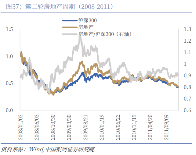 第二轮房地产周期(2008—2011年)在全球金融危机与政策刺激之间展开,地产板块与大盘依然保持较高相关性,但受政策调控影响明显增强。2008年全球金融危机爆发后,A股市场整体大幅下跌。随后刺激政策出台,信贷扩张与基建投资同步发力,房地产销售与投资迅速回升,地产股与宽基指数同步反弹。2010年以后,随着“新国十条”等调控政策出台,房地产市场逐步降温,地产板块与大盘指数均出现阶段性回落。总体而言,这一阶段地产对股市的影响仍然以宏观政策周期为主导。