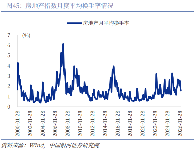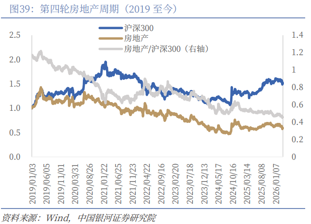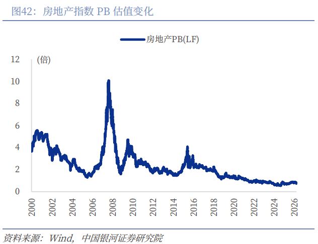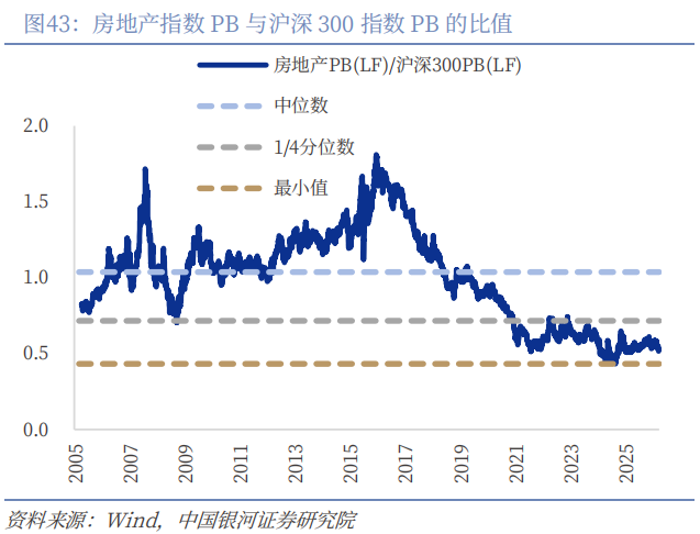 从指数表现看,我们以2000年初为基期,将房地产指数与沪深300指数进行同期比较,可以发现该比值在2017年前后达到历史峰值,到2025年末已降至2000年以来的最低水平。