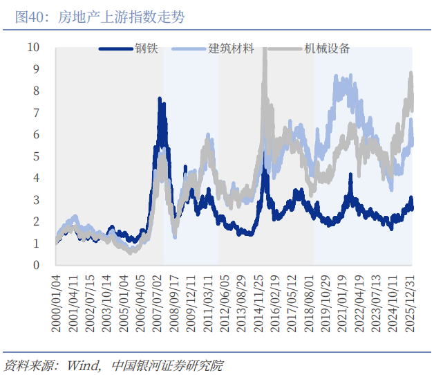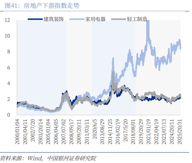 第四轮房地产周期(2019年至今),在地产周期调整影响下,A股走势有所承压,但A股总体行情对地产周期的敏感性正在趋于弱化。2020年“三道红线”与房地产贷款集中度管理政策出台后,房地产调控重心由价格管理转向债务约束,行业融资环境明显收紧。2021年至2022年间,多家房企出险,房地产行业进入集中出清阶段。2024年9月政治局会议提出推动房地产市场“止跌回稳”,政策目标逐步转向稳定市场预期与防范系统性风险。在这一阶段,地产指数自2021年起持续下行,而部分上游行业走势则与地产明显分化。例如建筑材料与机械设备指数在2021年之后保持相对强势,其需求来源逐渐由房地产施工转向制造业投资与基础设施建设。下游行业中,建筑装饰板块仍与地产景气度保持较高同步,而家用电器板块则延续此前的独立走势,与地产周期的相关性进一步减弱。