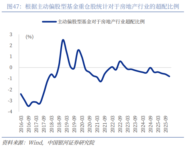 从资金面来看,公募基金对于地产板块的重仓仓位持续走低。以Wind开放式基金分类中的四类主动偏股型基金作为分析重点,包括普通股票型、偏股混合型、平衡混合型和灵活配置型,观察基金资产配置结构中房地产板块的仓位变化。2018年底以来,主动偏股型基金重仓的A股个股中,房地产板块的市值占比自高位回落。尤其是2022年三季度以来,房地产板块的市值规模和市值占比均处于下滑态势。2025年四季报显示,基金重仓的A股个股中,房地产板块市值为44亿元,占全部A股重仓股的市值比重仅为0.27%,较2022年三季度的2.71%明显下滑,更是远不及2018年四季度的高点7.27%,总体处于低配状态。