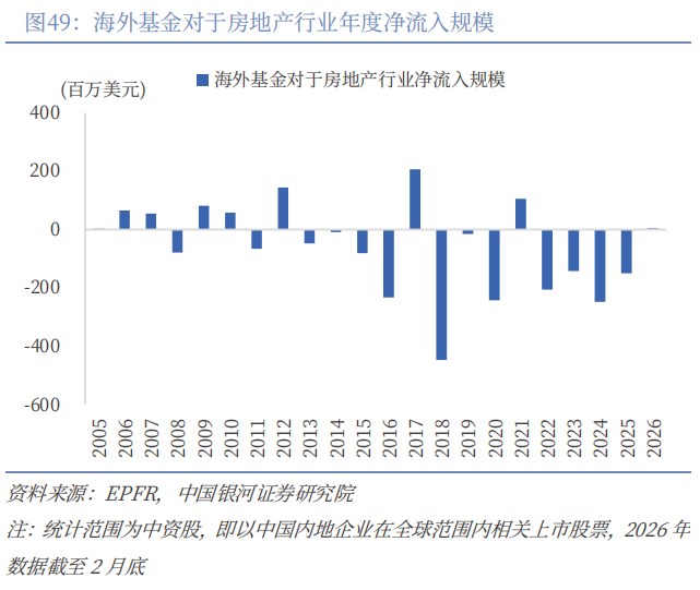 值得关注的是,资金面也出现了一些积极变化,外资配置出现边际回暖迹象。以年度口径统计,2022年至2025年间,海外基金持续流出内地房地产行业相关上市股票,其中,2025年净流出1.49亿美元,较2024年的2.47亿美元有所收窄。2026年1-2月,海外基金转为小幅净流入,净流入规模为479万美元。