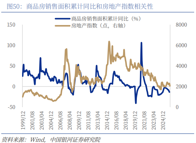 从历史经验看,房地产板块的行情启动往往出现在销售端率先企稳、市场预期发生边际改善之时。从数据相关性来看,商品房销售面积同比与房地产指数走势的相关性明显高于房地产开发投资同比,这意味着地产股定价更多反映销售预期,而非当期投资或施工数据。当销售改善带来现金流回暖、融资环境稳定后,开发投资才会逐步回升。因此在多数地产周期中,地产股上涨通常领先投资数据1-2个季度,市场定价更偏向对销售复苏和政策宽松的预期。
