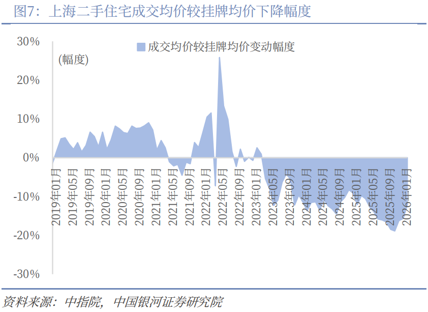 上海二手住宅实际成交均价较挂牌均价的跌幅在收窄。2025年2月至今,上海二手住宅挂牌均价逐月下行。2025年4月-2025年11月,上海二手住宅成交均价较挂牌均价的降幅逐月扩大,2025年11达到18.87%。2025年12月-2026年2月,该降幅在逐渐收窄。尽管挂牌均价在持续下降,但成交均价从2025年12月-2026年2月逐月提高,并且成交均价较挂牌均价的降幅逐月收窄。
