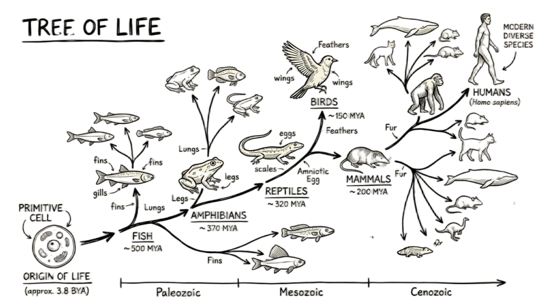 这是我很喜欢一张生物进化图,从单细胞生物到人类,整个过程没有固定脉络,本质是变异与时间沉淀的结果。