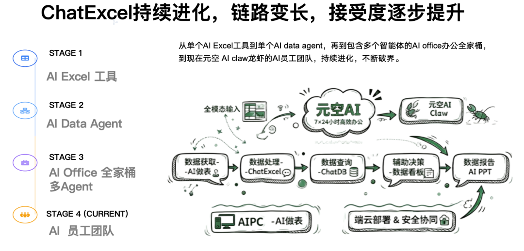 我们定位“AI for data”,从单场景单任务,逐步拓展到全模态数据处理,推出ChatDB、数据看板、AI PPT、AI文档报告等产品,从单点Agent延伸到全产业链服务,这个过程既依托模型成熟,也顺应了用户需求的变化。