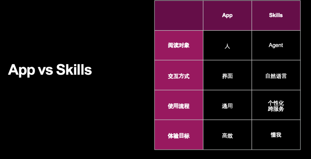 在他看来,App与Skill有本质不同。前者面向人类、以图形界面交互、流程通用、追求用完即走;后者服务于AI Agent,采用自然语言或命令行交互,流程个性化、注重理解用户。