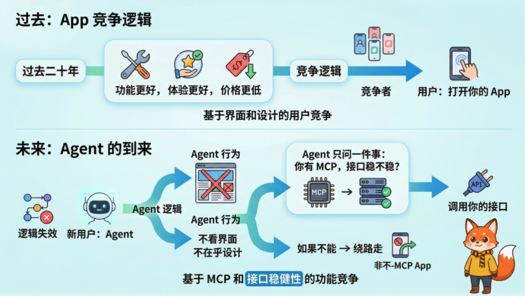 而AI Agent到来后,竞争彻底改写:新用户不再是人,而是Agent。Agent不看界面、不在乎设计,唯一决策标准是你有没有MCP(模型上下文协议)?接口稳不稳?