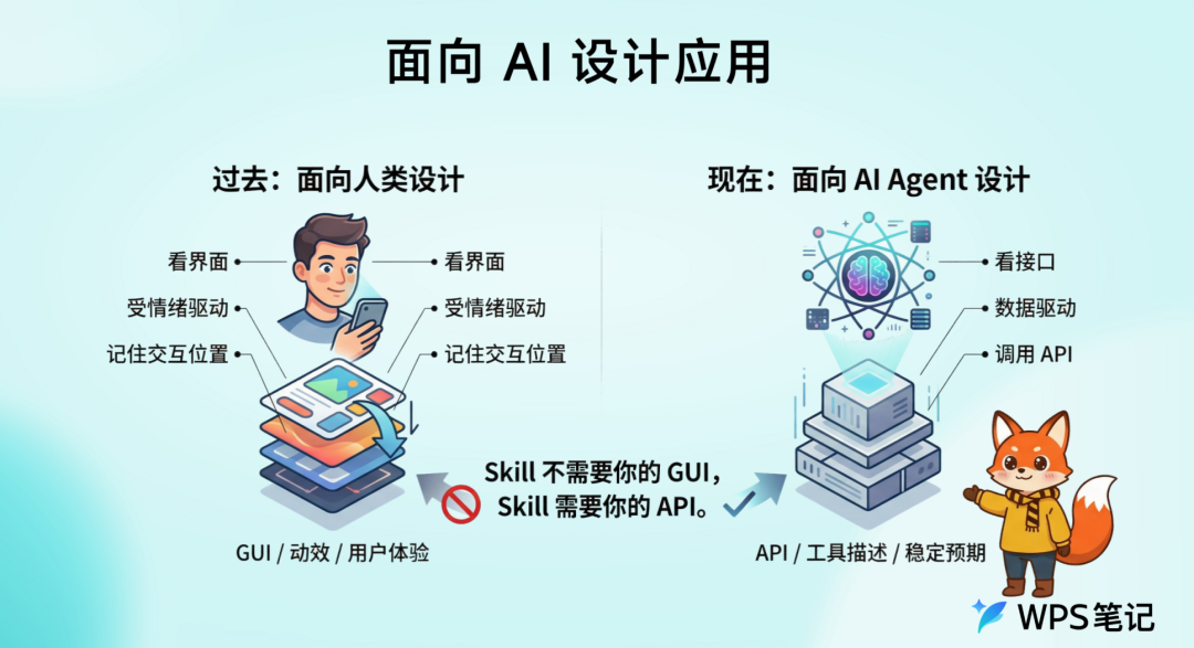 从本质看,App和Skill是完全不同的产物。App服务人类,靠图形界面点击交互,使用流程通用标准化,核心逻辑是用完即走。