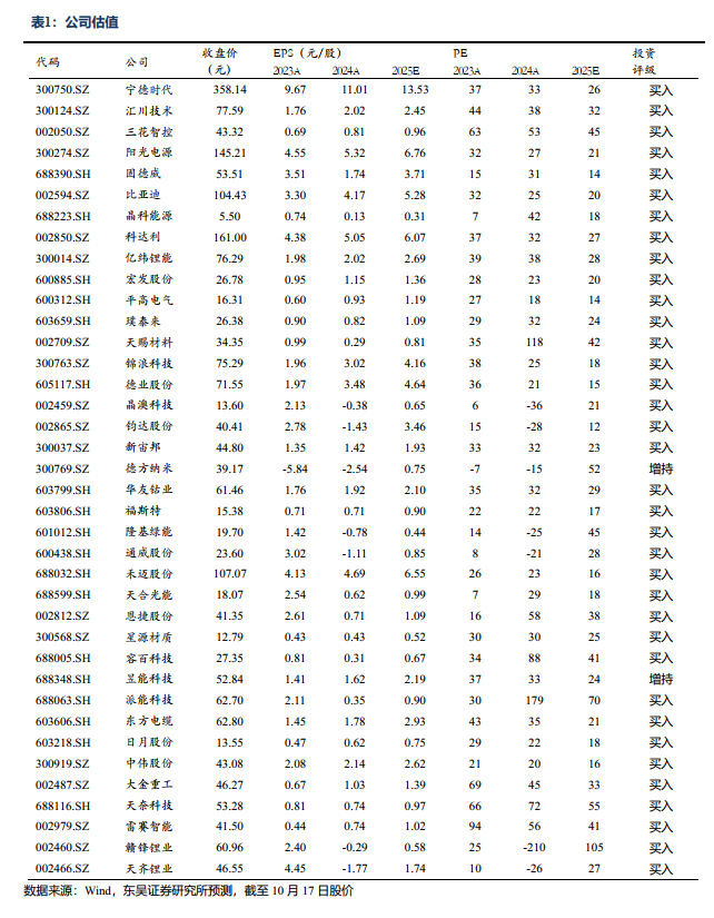 投资建议:宁德时代(动力&储能电池全球龙头、盈利和增长确定估值低)、阳光电源(逆变器全球龙头、海外大储集成优质龙头、切入AIDC)、亿纬锂能(动力&储能锂电上量盈利向好并走出特色之路、消费类电池稳健)、三花智控(热管理全球龙头、特斯拉机器人总成空间大)、科达利(结构件全球龙头稳健增长、谐波为核心的人形零部件总成潜力大)、湖南裕能(铁锂正极龙头强、高端产品供需紧张涨价在即)、四方股份(二次设备龙头估值低、SST优势明显并大力拓展)、海博思创(国内大储龙头提前卡位优势明显、积极开拓海外储能)、天赐材料(电解液&六氟龙头、新型锂盐领先)、厦钨新能(钴酸锂需求盈利向好、卡位硫化锂固态潜力大)、大金重工(海风出口布局厚积薄发、量利双升超预期)、当升科技(三元正极龙头、固态电解质技术领先)、思源电气(电力设备国内出海双龙头、订单和盈利超预期)、上海洗霸(全面布局固态、有研合资硫化锂有望领先)、华友钴业(锂电资源材料一体化布局、钴管控价格和盈利有望超预期)、欣旺达(消费锂电盈利向好、动储锂电上量盈利在即)、璞泰来(负极龙头盈利拐点隔膜涂敷稳增、固态电池设备&材料领先)、尚太科技(负极龙头份额提升超预期、成本优势大盈利能力强)、金盘科技(干变全球龙头海外全面布局、AIDC大力布局)、汇川技术(通用自动化弱复苏龙头Alpha明显、联合动力持续超预期)、比亚迪(电动车销量持续向好且结构升级、全民智驾超预期)、金风科技(风机毛利率恢复有望超预期、风电运营稳健)、富临精工(高压实铁锂领先且获宁德控股扩产、机器人布局深厚)、东方电缆(海缆壁垒高格局好,海风项目开始启动)、优优绿能(充电桩模块龙头、大力布局HVDC)、天奈科技(碳纳米管龙头、快充&硅碳&固态持续受益)、浙江荣泰(云母龙头增长确定、丝杠及总成大客户进展迅速)、震裕科技(结构件盈利逐步修复、关节总成拓展到手臂总成空间大)、艾罗能源(老牌户储龙头、工商储率先起量)、阿特斯(一体化组件头部企业、深耕海外大储进入收获期)、德业股份(新兴市场开拓先锋、户储爆发工商储蓄势)、锦浪科技(欧洲去库完成逆变器迎来拐点、新兴市场销售提升提供支撑)、纳科诺尔(干法设备龙头、固态设备全面布局)、容百科技(高镍正极龙头、海外进展超预期)、北特科技(丝杠头部批量空间大、汽零平稳)、伟创电气(变频伺服持续增长、大力布局人形机器人)、新宙邦(电解液&氟化工齐头并进)、星源材质(干法和湿法隔膜龙头、LG等海外客户进展顺利)、麦格米特(多产品稳健增长、英伟达供应商AIDC潜力大)、远航精密(镍带箔龙头、固态镍基潜力大)、良信股份(断路器优质标的,率先切入海外AIDC供应链潜力大)、雷赛智能(伺服控制器龙头企业、机器人关节批量优势明显)、盛弘股份(受益海外和国内AI资本开支、海外储能新客户拓展)、宏发股份(传统继电器稳增长、高压直流和PDU持续高增长)、禾迈股份(微逆去库尾声重回高增长、储能产品开始导入)、斯菱股份(车后轴承市场稳定增长、打造谐波第二增长曲线)、祥鑫科技(汽零和结构件稳健、积极布局人形/AIDC/液冷)、三星医疗(海外配网和电表需求强劲、国内增长稳健)、固德威(组串逆变器持续增长,储能电池和集成逐步恢复)、隆基绿能(单晶硅片和组件全球龙头、BC技术值期待)、爱旭股份(ABC电池组件龙头、25年大幅放量)、通威股份(硅料龙头受益供给侧改革、电池和组件有望改善)、科华数据(全面受益国内AI资本开支新周期、数据和数能双星驱动)、晶澳科技(一体化组件龙头、盈利率先恢复)、晶科能源(一体化组件龙头、Topcon明显领先)、天合光能(210一体化组件龙头、户用分布式和渠道占比高)、聚和材料(银浆龙头、铜浆率先布局)、福斯特(EVA和POE胶膜龙头、感光干膜上量)、国电南瑞(二次设备龙头、稳健增长可期)、鸣志电器(步进电机全球龙头、机器人空心杯电机潜力大)、帝科股份(银浆龙头、银包铜银浆率先量产在即)、曼恩斯特(磨头龙头持续高增、多品类扩张布局固态和人形)、日月股份(大铸件紧缺提价可期,盈利弹性大)、上能电气(逆变器地面地位稳固、大储PCS放量在即)、平高电气(特高压交直流龙头、估值低业绩持续超预期)、许继电气(一二次电力设备龙头、柔直弹性可期)、中伟股份(三元前聚体龙头、镍锂金属布局可观)、明阳智能(海上风机龙头、风机毛利率修复弹性大)、福莱特(光伏玻璃龙头成本优势显著、价格底部有望企稳反弹)、钧达股份(Topcon电池龙头、扩产上量)、三一重能(成本优势明显、双海战略见成效)、天齐锂业、赣锋锂业、中矿资源、盛新锂能、艾罗能源、中国西电、禾望电气、恩捷股份、天顺风能、德方纳米、昱能科技、永兴材料、威迈斯、儒竞科技、派能科技、元力股份、大金重工、安科瑞、海兴电力、中熔电气、天齐锂业、日月股份、三一重能、金风科技。建议关注:海辰药业、峰岹科技、英联股份、凌云股份、宏工科技、科士达、英维克、明阳电气、多氟多、天际股份、东方电气、中信博、东威科技、宇邦新材、海力风电、新强联、通灵股份、快可电子、中科电气、美畅股份、琏升科技、信捷电气、振华新材、大全能源、通合科技、金雷股份、禾川科技、嘉元科技、 TCL中环、弘元绿能、东方日升等。