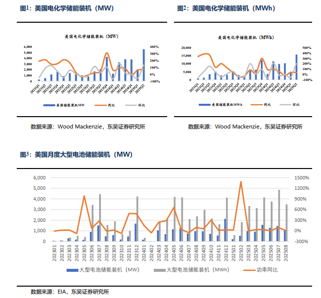 根据EIA数据,美国大储8月新增装机1085MW,同环比 13%/-25%,对应3489MWh,同环比 47%/-28%,平均配储时长3.2h。2025年1-8月累计装机8043MW,同比 33%,对应25.1GWh,同比 46%。根据Wood Mackenzie数据,25Q2美国储能15.8GWh,同环比 37%/ 214%,全年指引52.5GWh,增45%。其中,Q2大储装机15.0GWh,同环比 36%/267%;Q2工商储装机85MWh,同环比-2%/ 35%;Q2户储为0.8GWh,同环比 76%/-16%。考虑美国关税大幅提升,中国电芯产能转移至东南亚以规避关税,预计长期可持续稳健增长。
