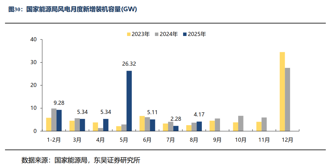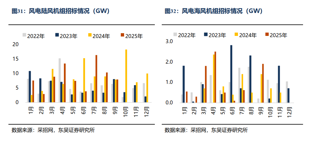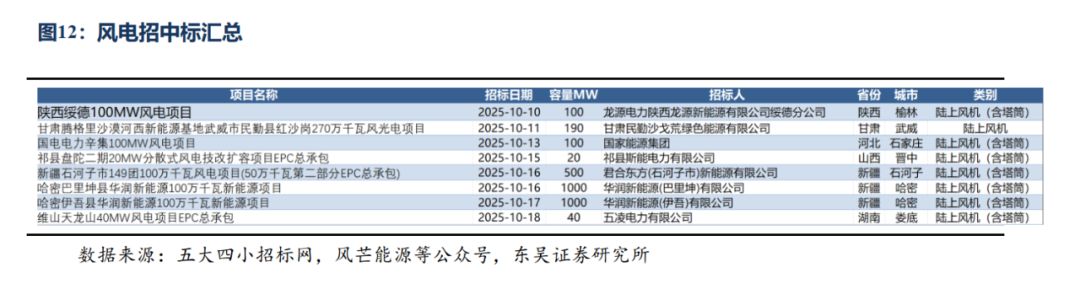 本周招标2.81GW,陆上2.81GW/海上暂无;本周开/中标暂无。本月招标4.21GW,同比-23.77%:陆上3.8 GW/海上0.41GW,同比-25.78%/ 2.00%。25年招标 92.57 GW,同比 17.37%:陆上 83.42 GW/海上 9.15GW,同比 15.57%/同比 36.97%。本月开标均价:陆风1620元/KW,陆风(含塔筒)2112元/KW。
